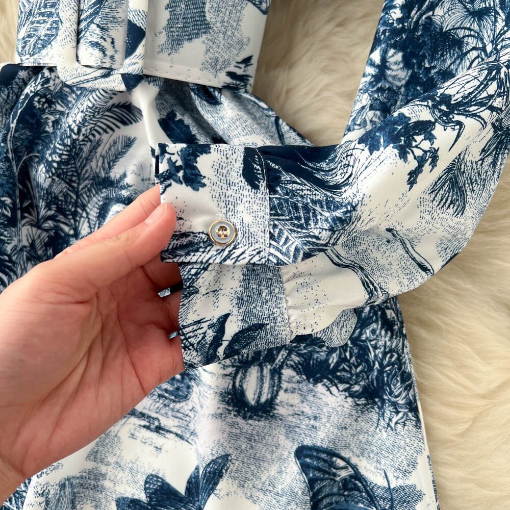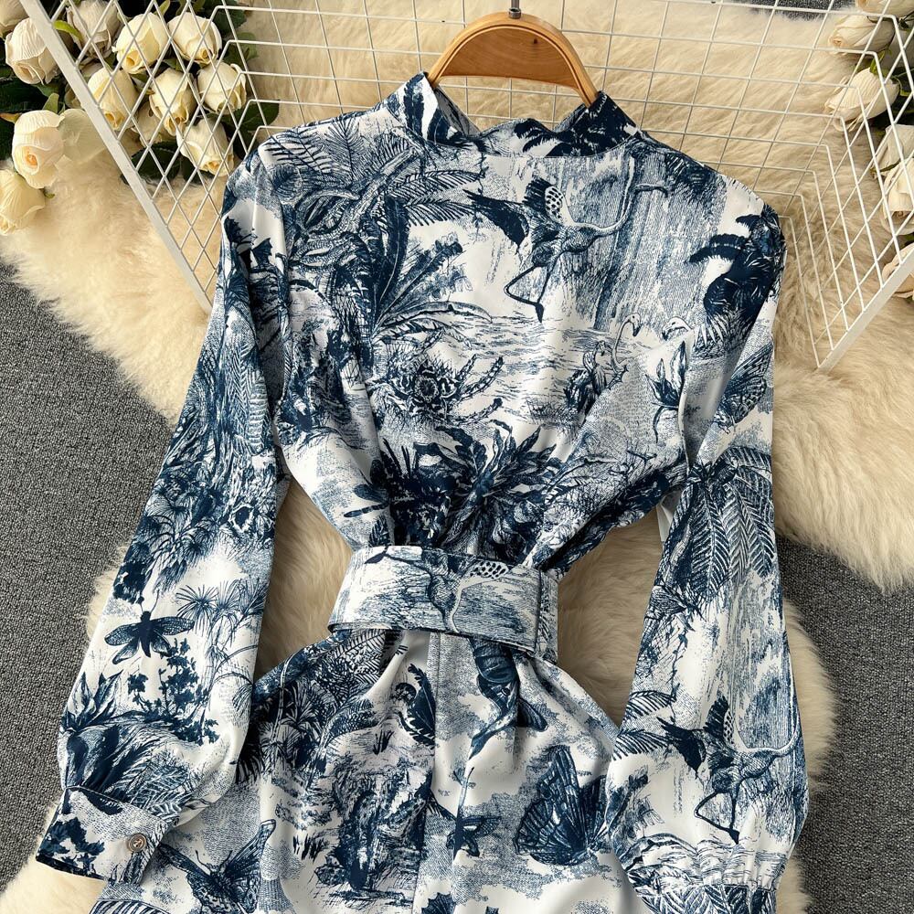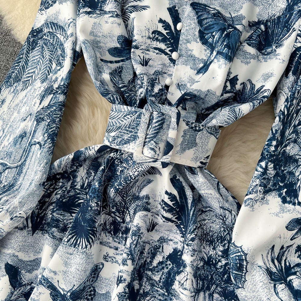 春の新しいエスニックスタイルのパフスリーブウエストと膝上スイングロングスカートファッション印刷ラペルウエストドレス スプリング 春物 lyxaj31307539279