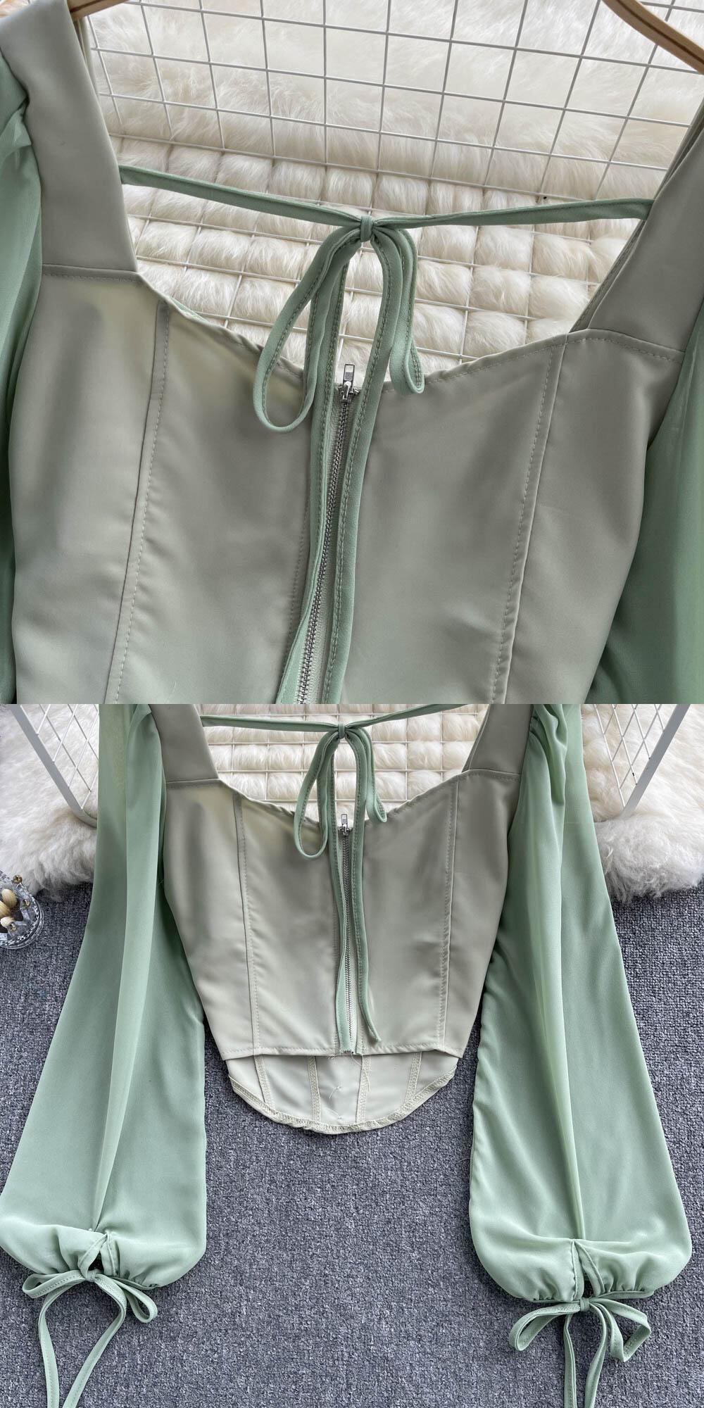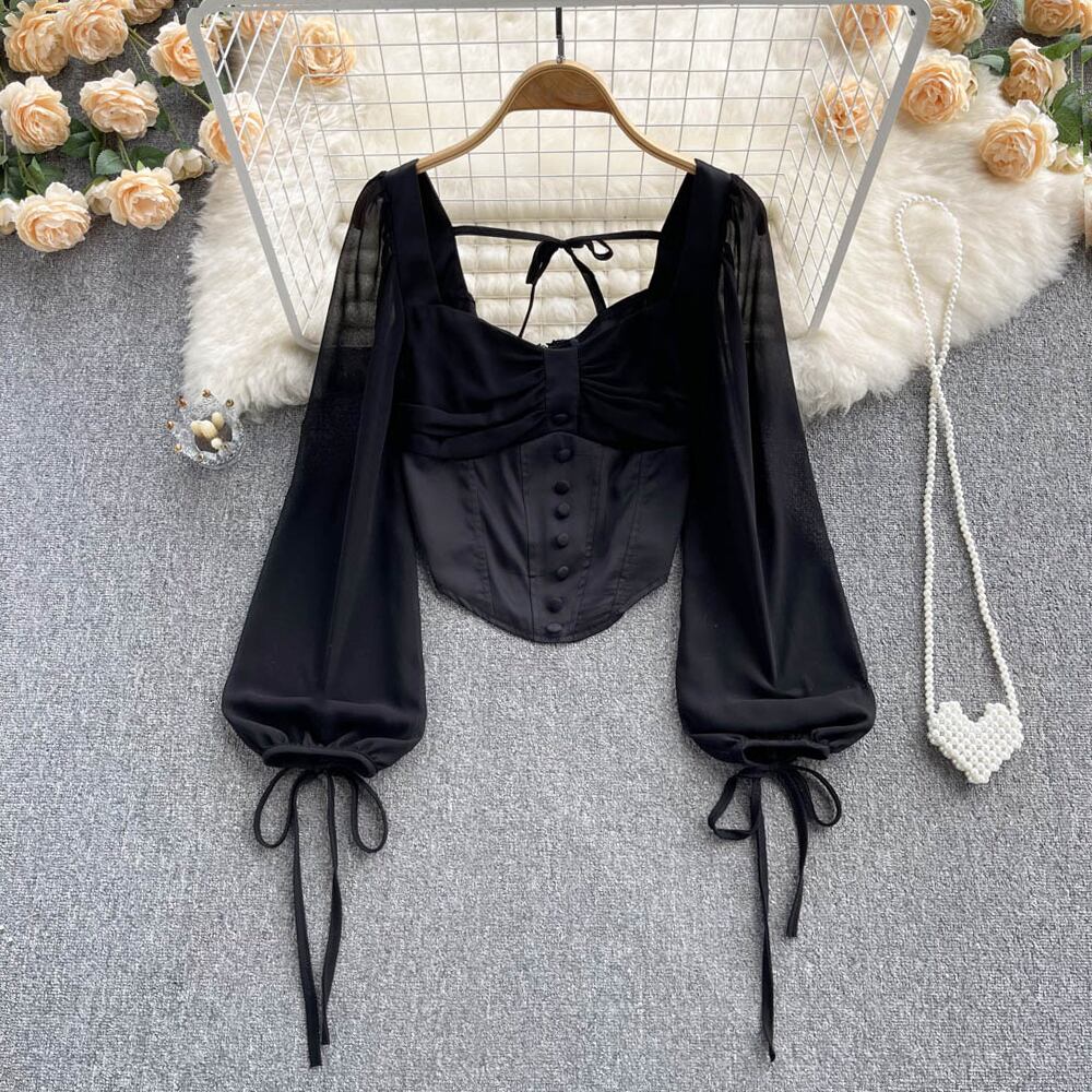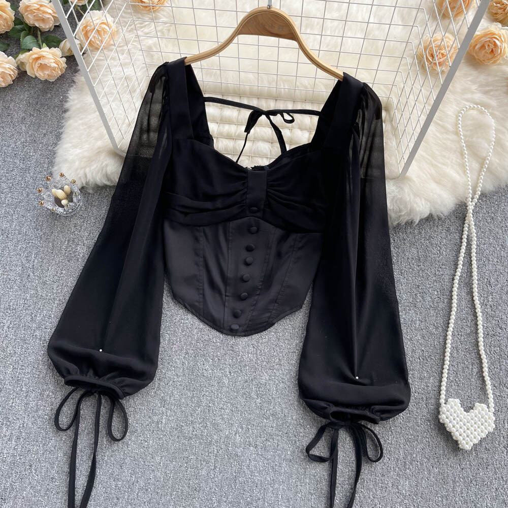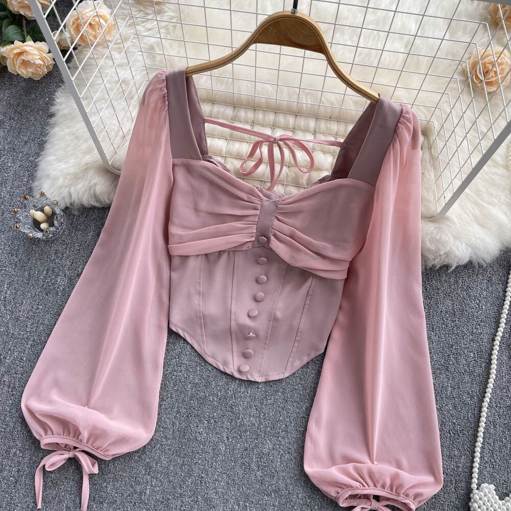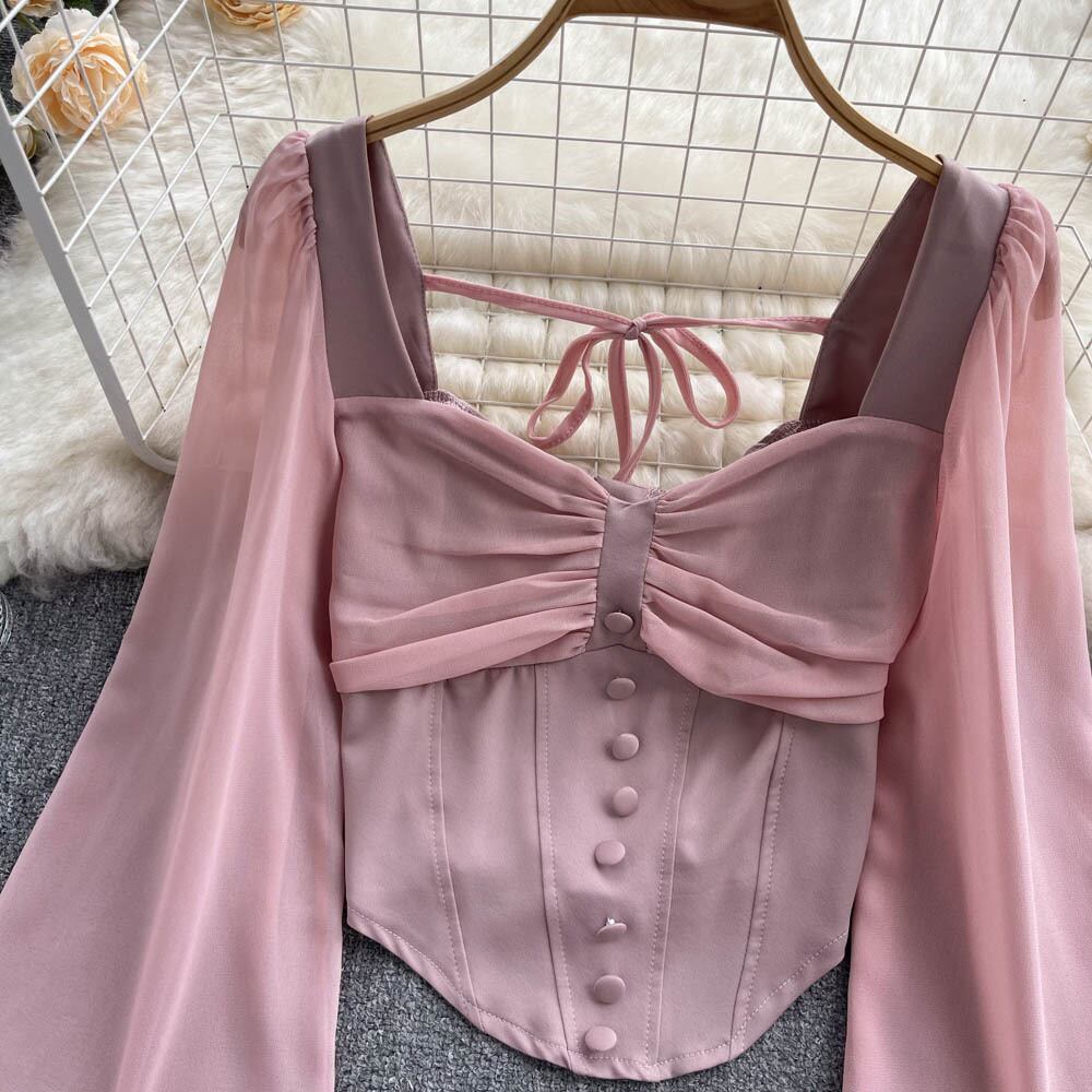 2022年春の新しいフレンチデザインのスクエアネックホルターストラップランタンスリーブ長袖シャツフレンチレトロトップ ロング スプリング 春物 スクウェア lyxaj42474649665