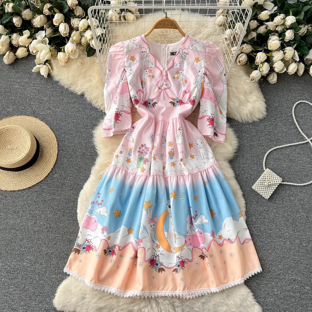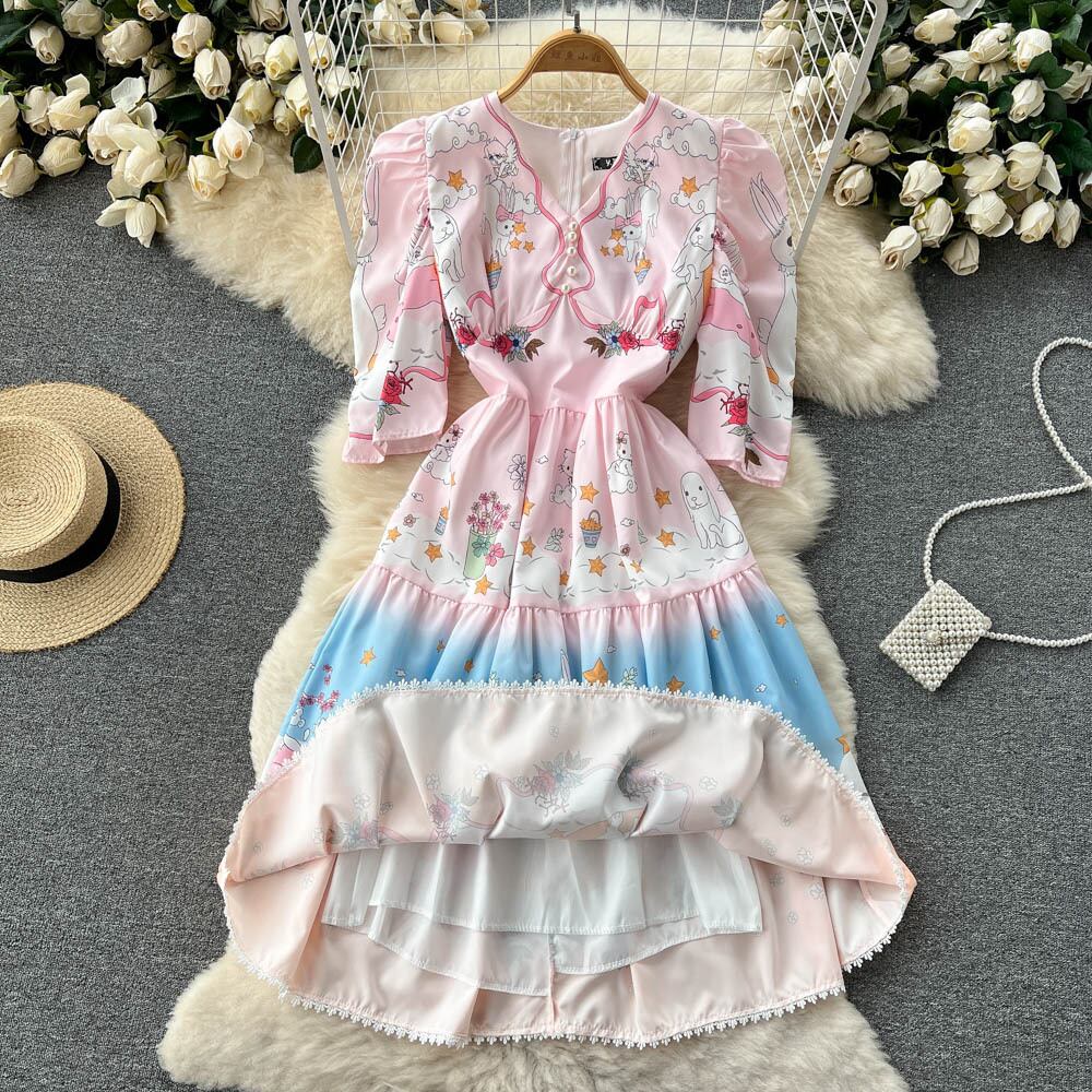 日本人の女の子甘い少し新鮮なVネックデザイン小さなフレンチドレスハイウエストビッグスイングドレスプリンセススカート ハイウェスト 大人ガーリー スウィート キュート カジュアル lyxaj27710304539