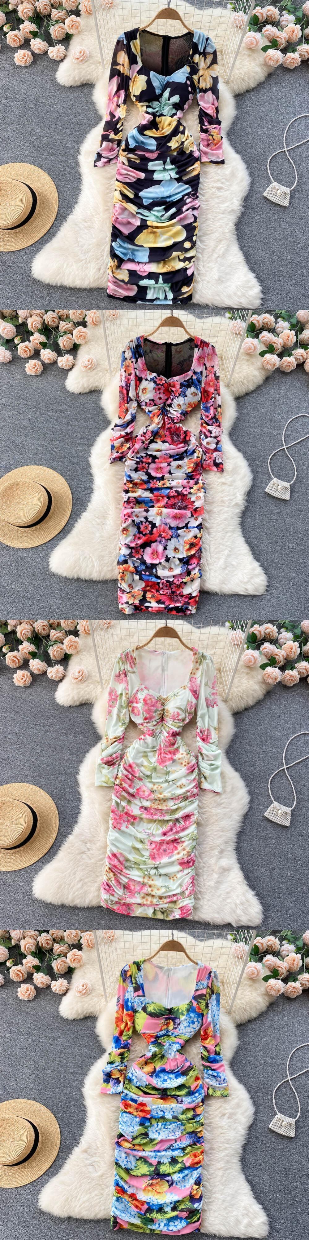 ヨーロッパとアメリカのins新しいパフスリーブメッシュガーゼプリーツ弾性ウエストバッグヒッププリントドレススクエアカラーローカットロングスカート エラスティック 伸縮 スクウェア ヨーロピアン lyxaj78465457596