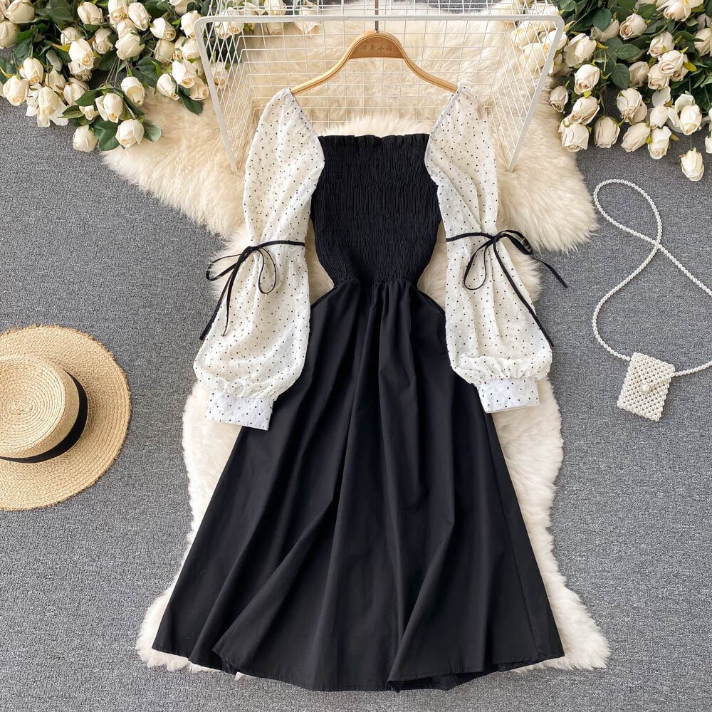フレンチジェントルスタイルスクエアカラー気質ウエストワンピース水玉ネクタイ長袖デザインスーパーフェアリーAラインミドル丈スカート ロング スクウェア lyxaj50936482388