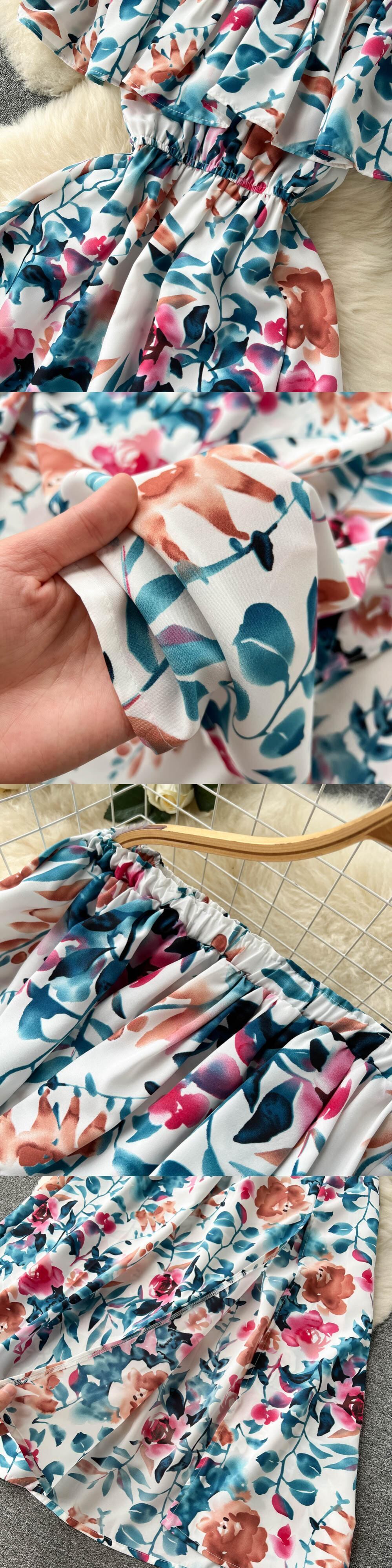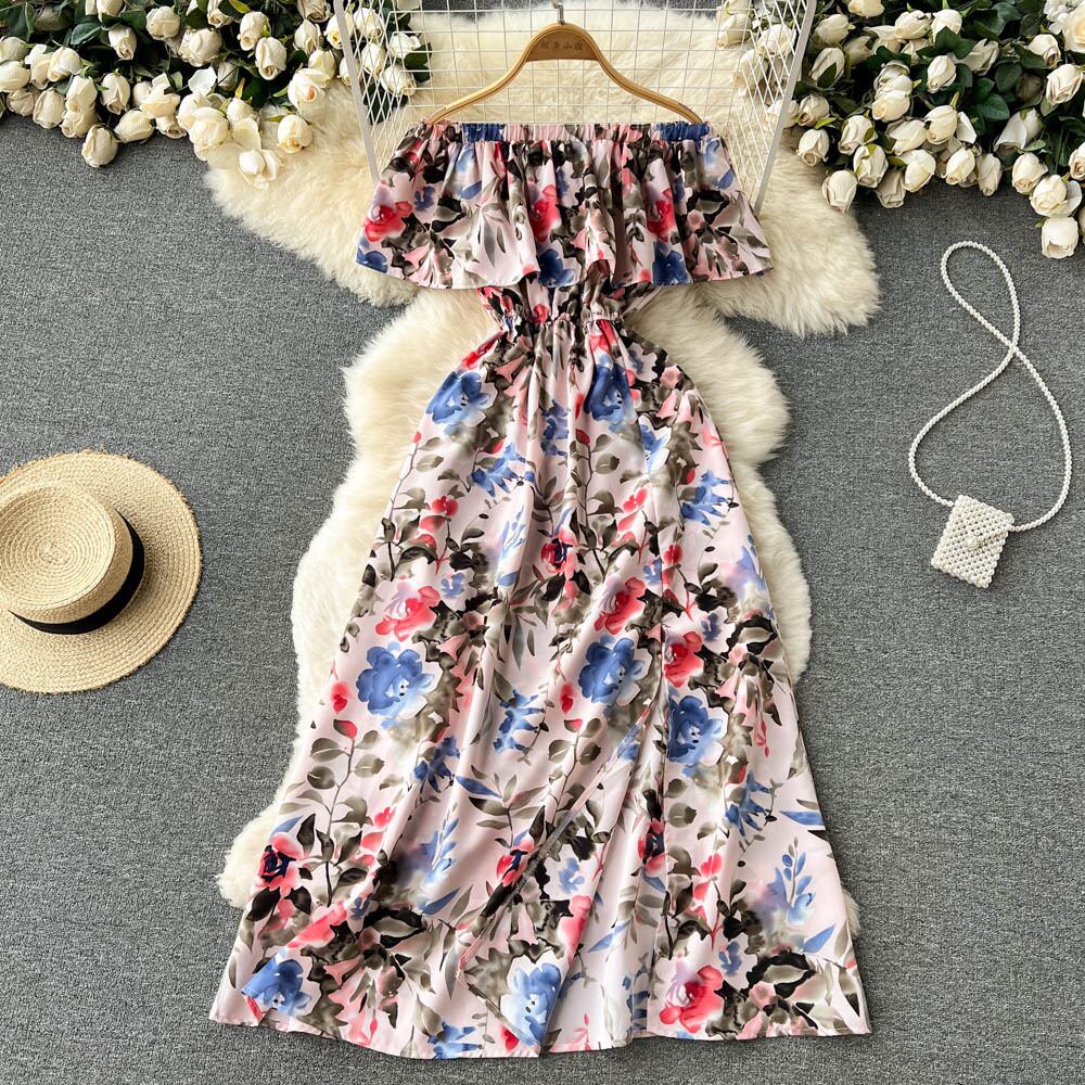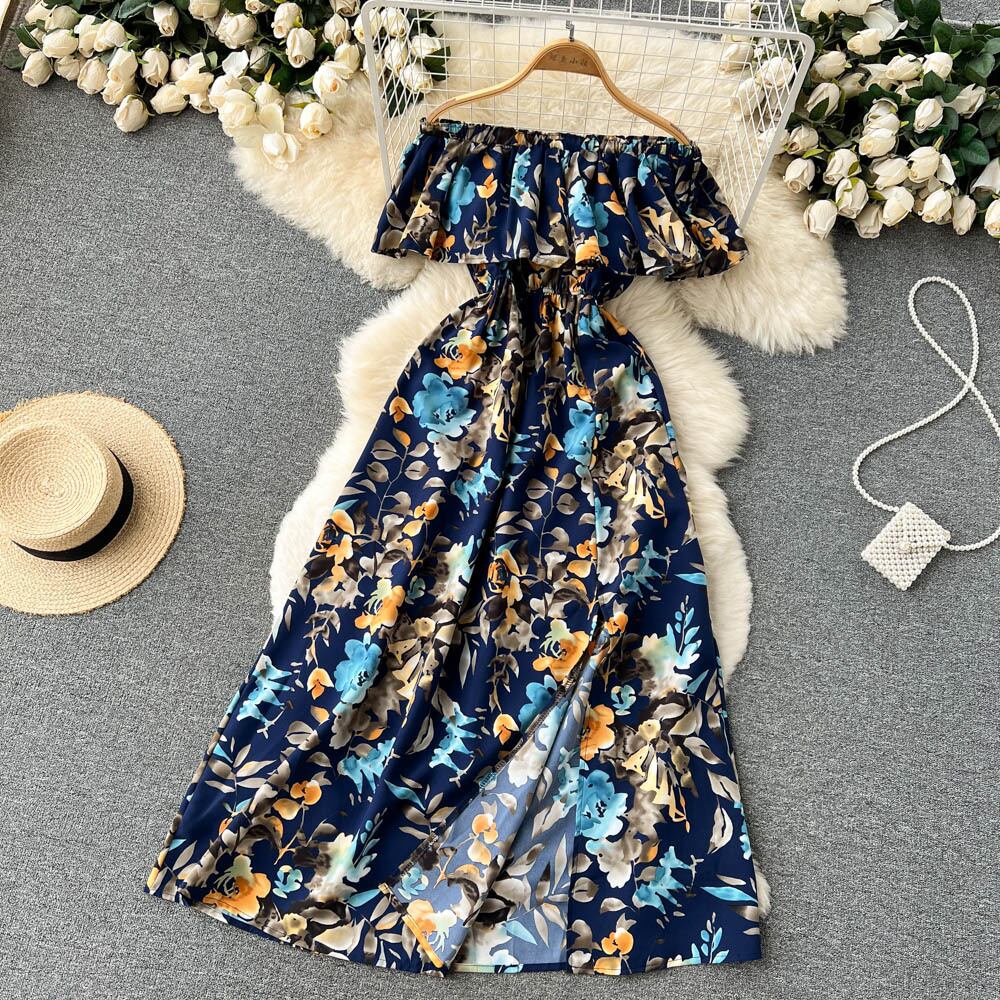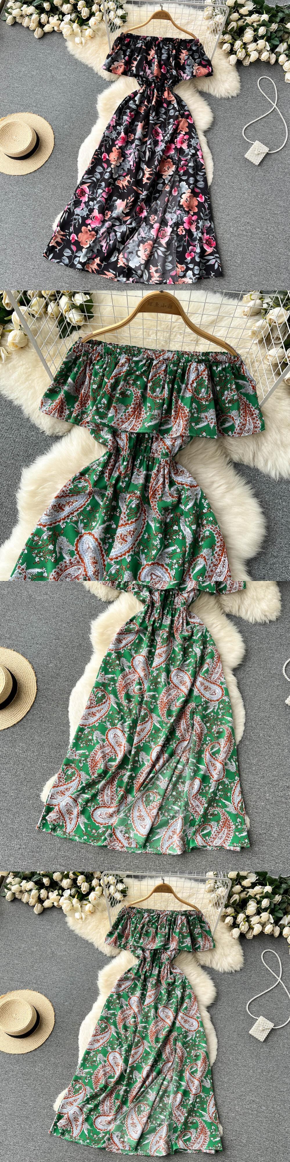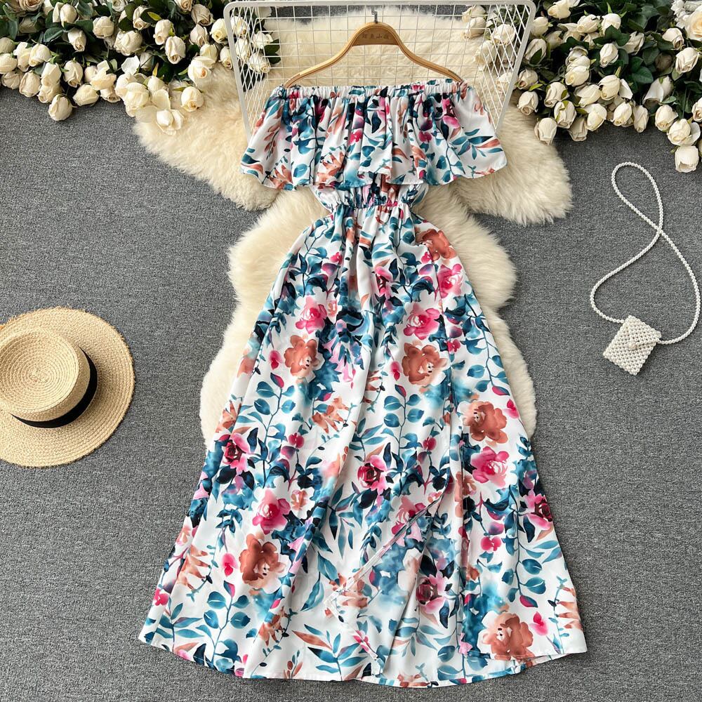 2022年夏の穏やかな風のスーパーフェアリーフォレストプリントスリットドレスセクシーなオフショルダーウエストのような気質のホリデースカート サマー 夏物 lyxaj2937143208