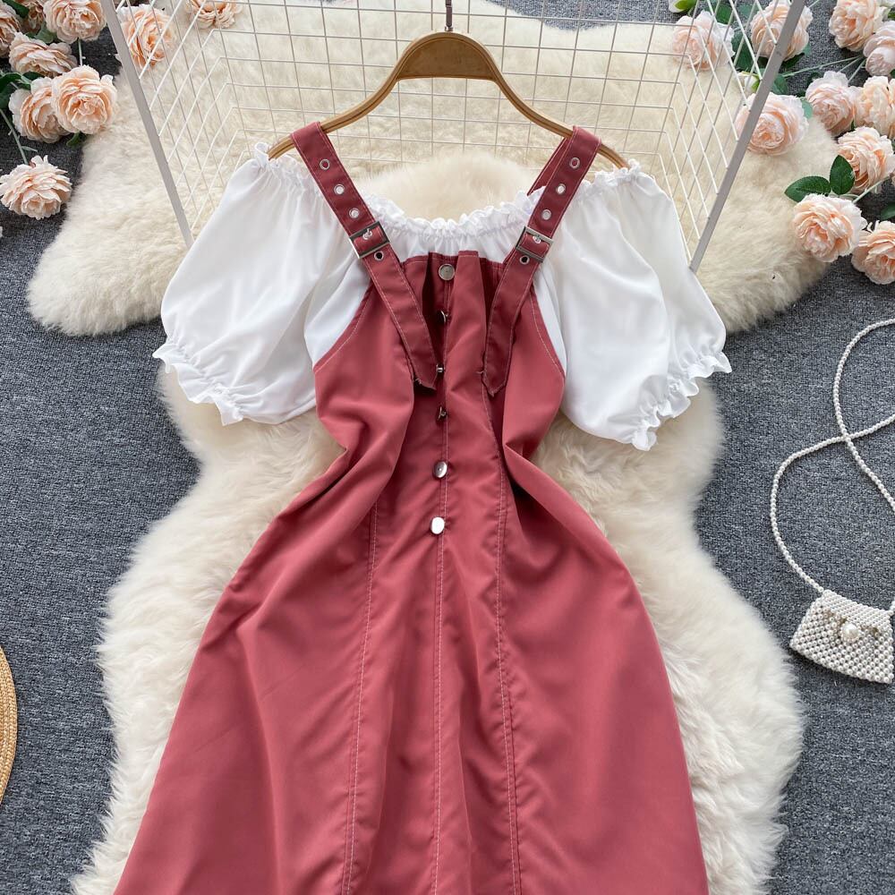 偽のツーピースドレス女性2022年夏の新しい大学スタイルのサスペンダースカートミドル丈甘い韓国のスカートトレンディ 大人ガーリー スウィート キュート カジュアル サマー 夏物 lyxaj17567504844