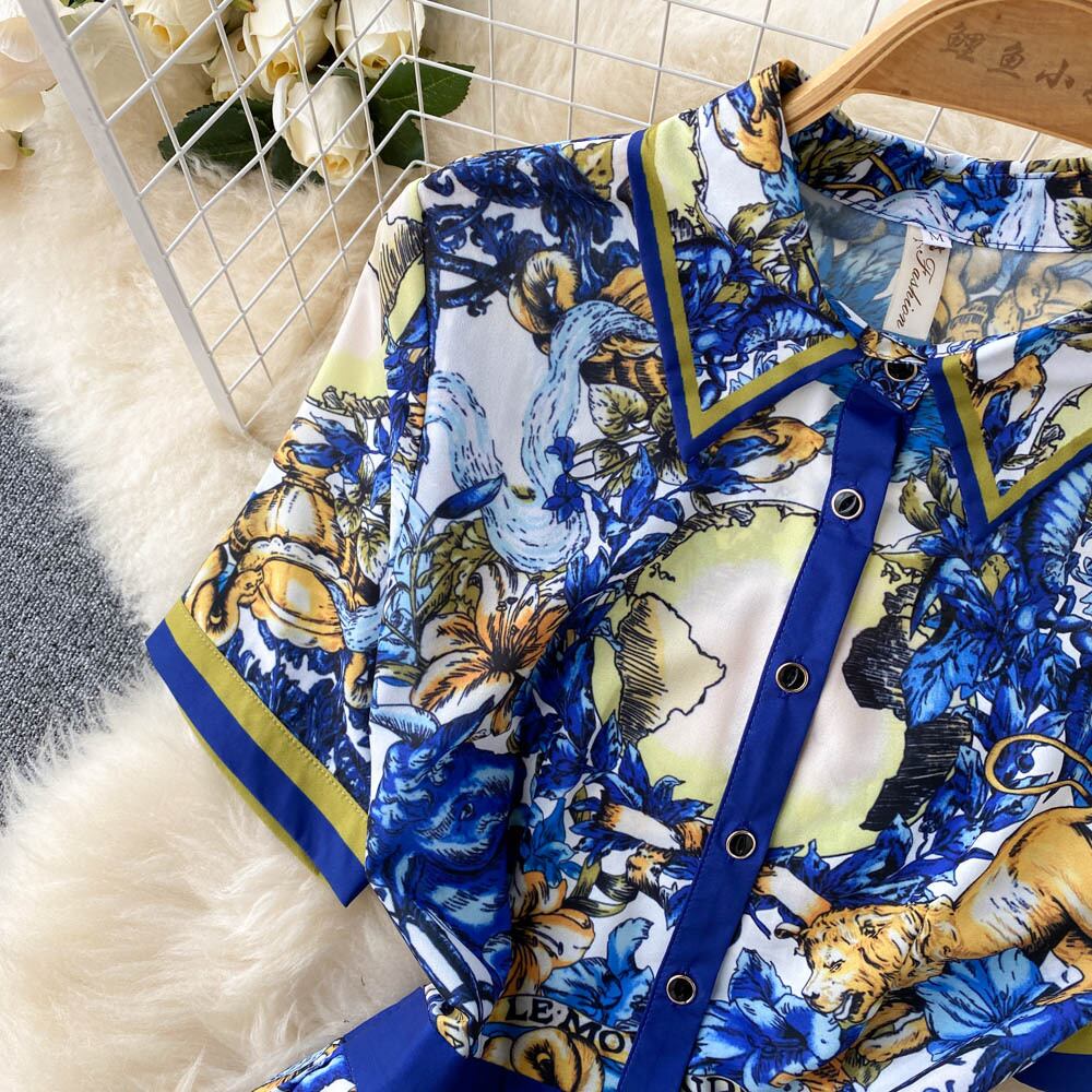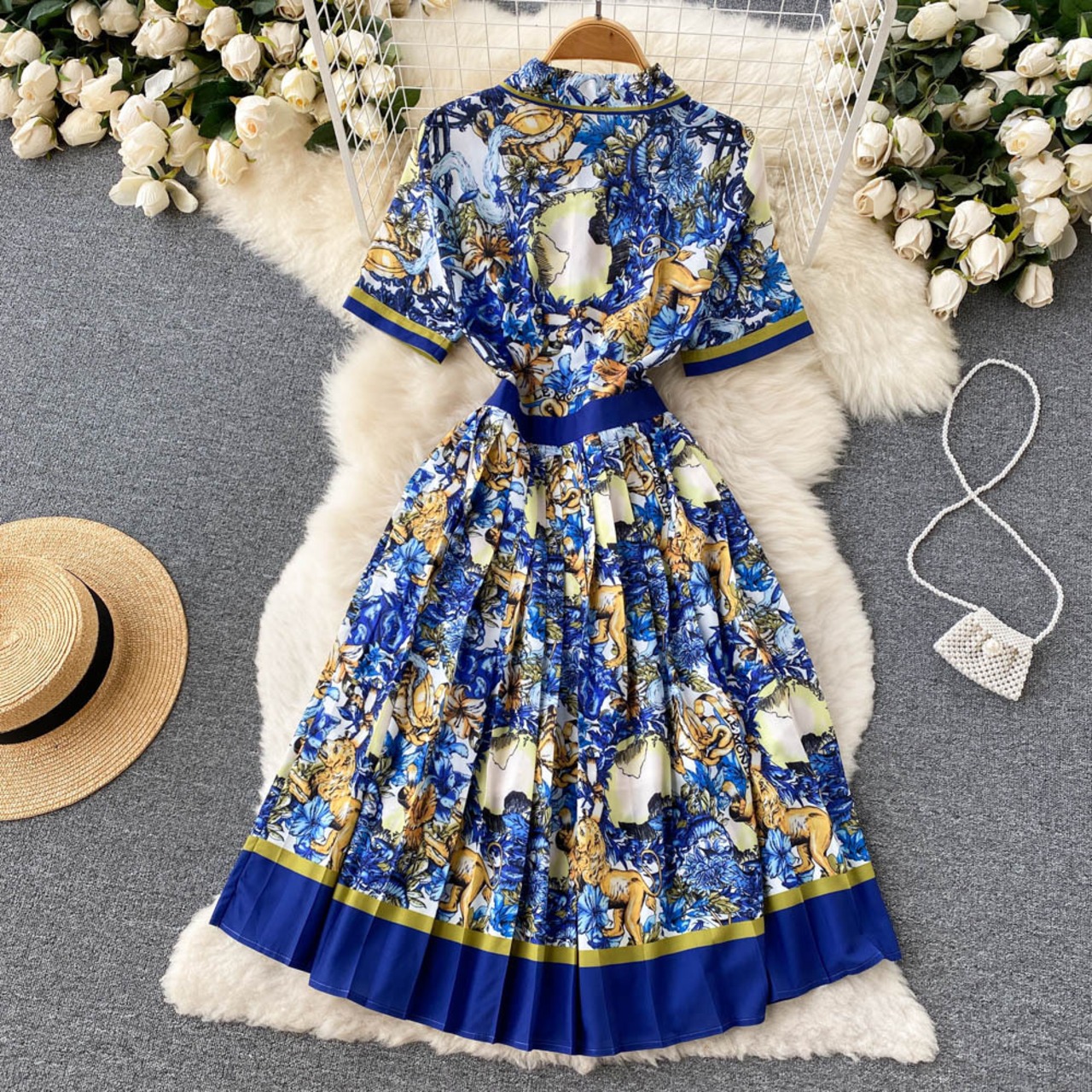 夏の新女神ファンレトロプリントデザインセンスレディ気質半袖ワンピースミドル丈プリーツスカート サマー 夏物 lyxaj73775266827