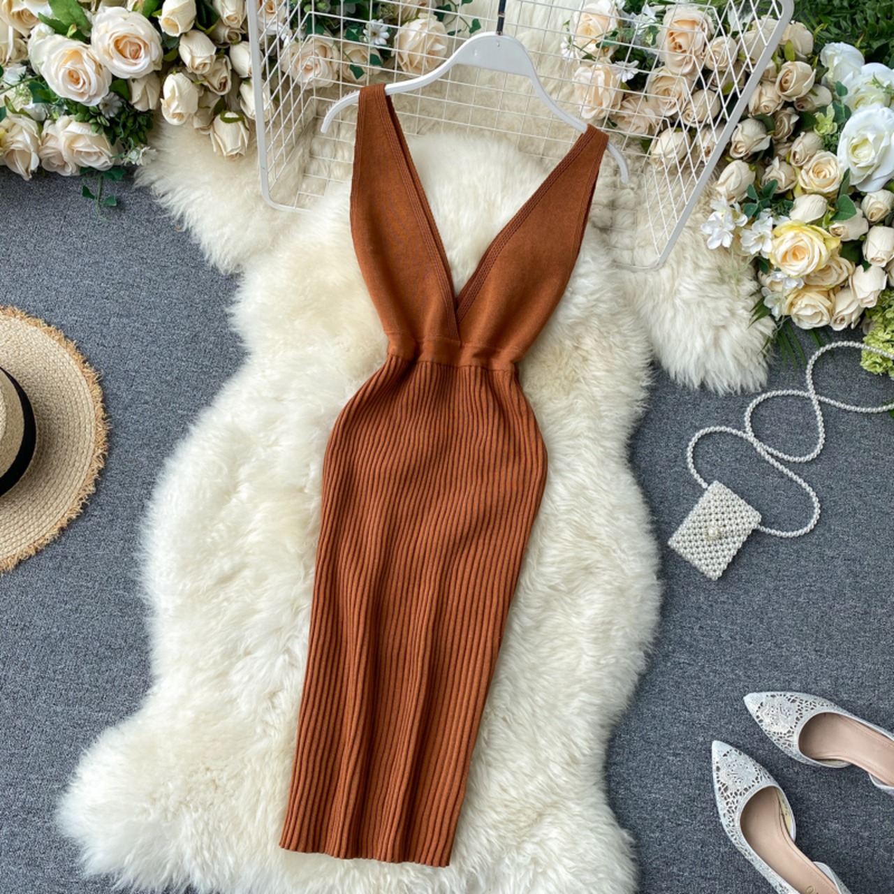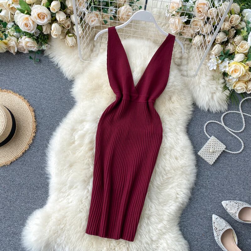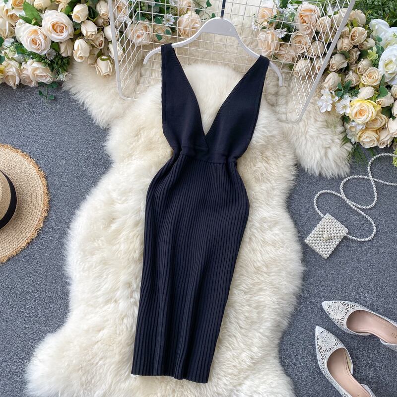 2020年ヨーロッパとアメリカのインセクシーなディープVネックの背中の開いたウエストとヒップの伸縮性のあるニットベストスカートの女性のサマードレス エラスティック 夏物 ヨーロピアン lyxaj38621308116