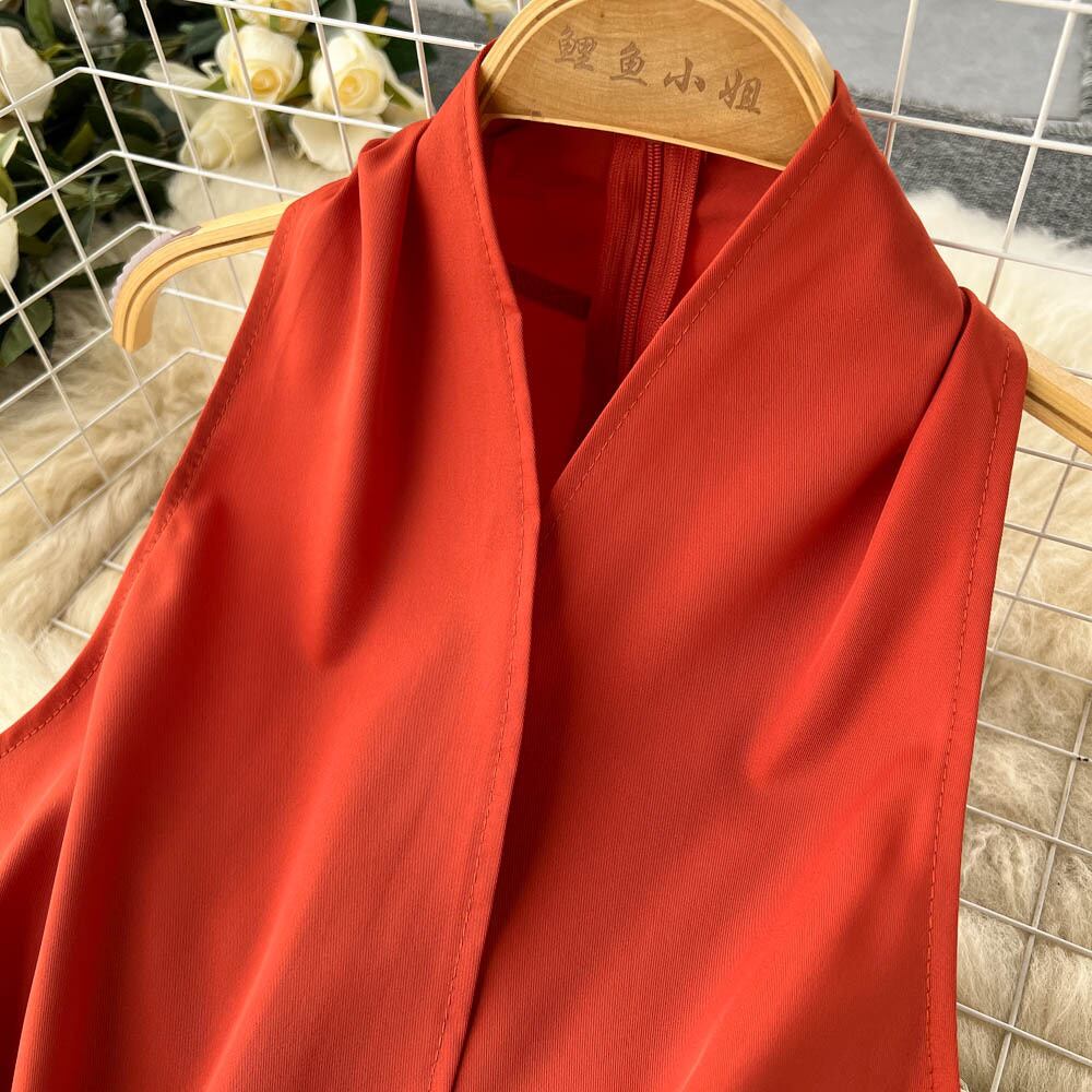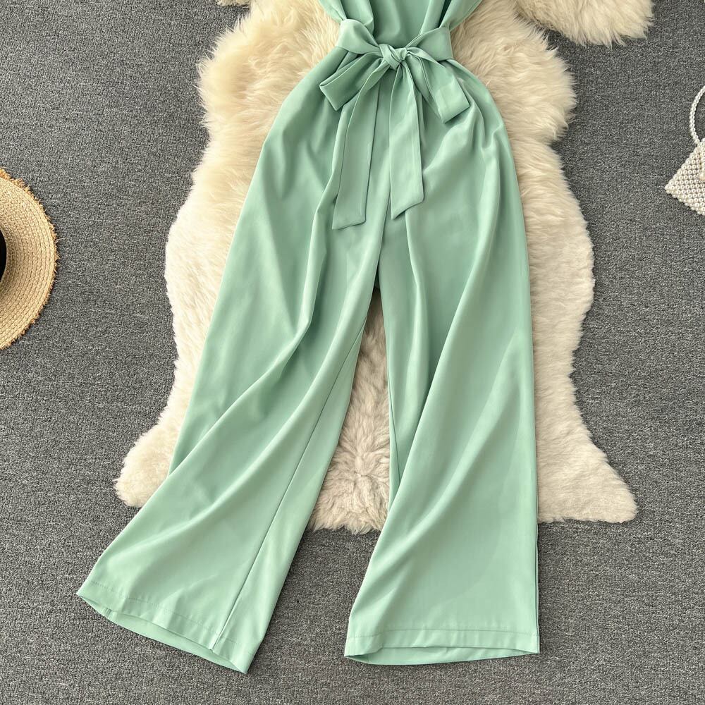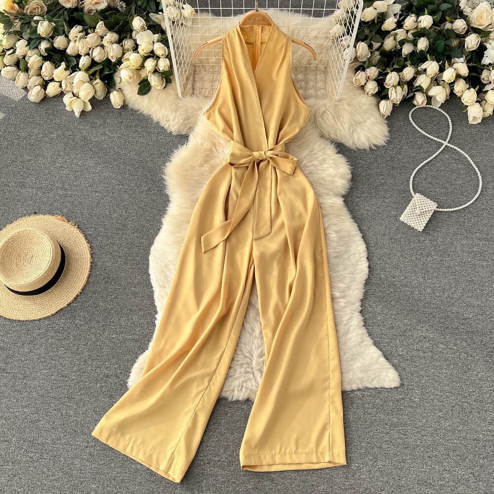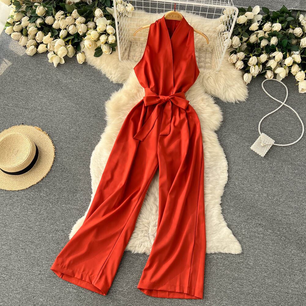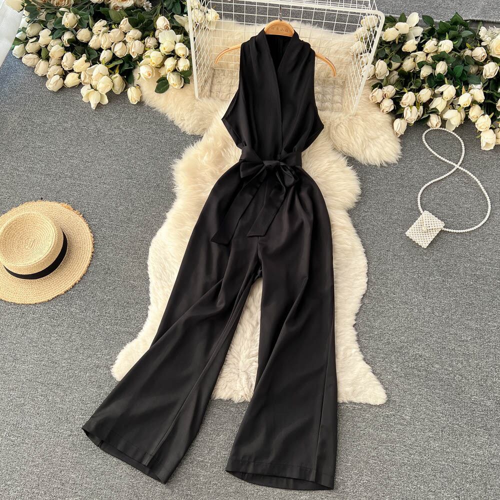 2022年の新しい黒のホルタージャンプスーツの女性のハイウエストワイドレッグパンツ冷風気質細いウエストカジュアルパンツ夏 ハイウェスト ブラック サマー 夏物 ワイドパンツ lyxaj95108682461