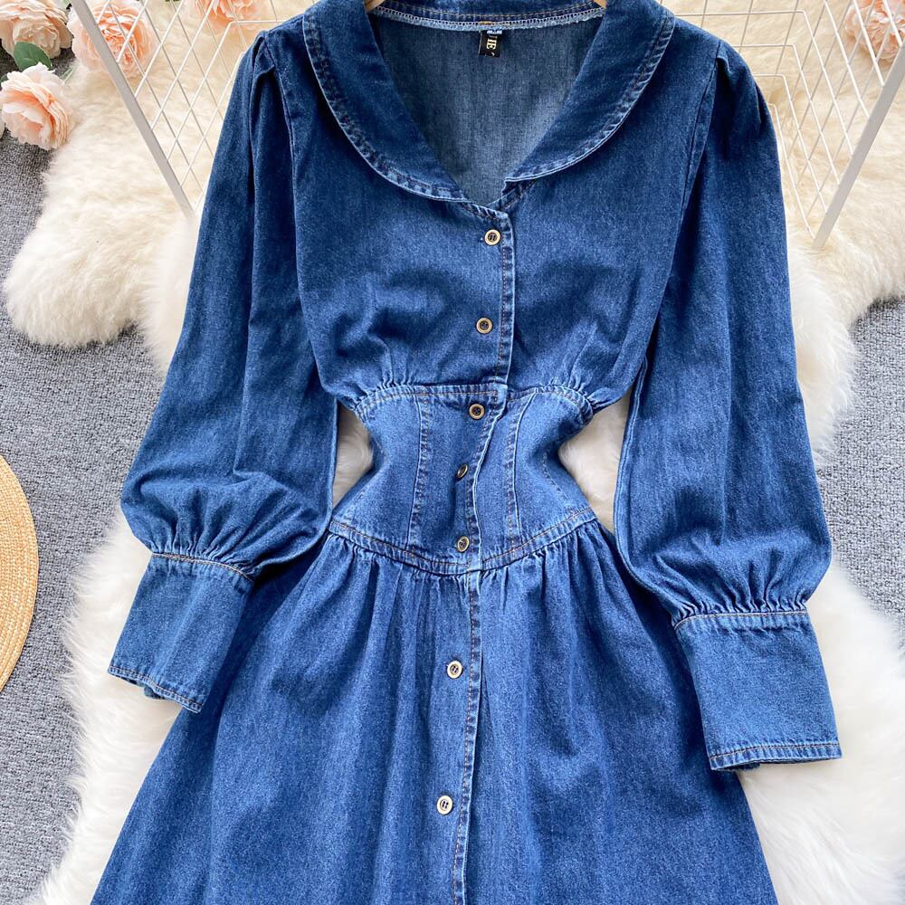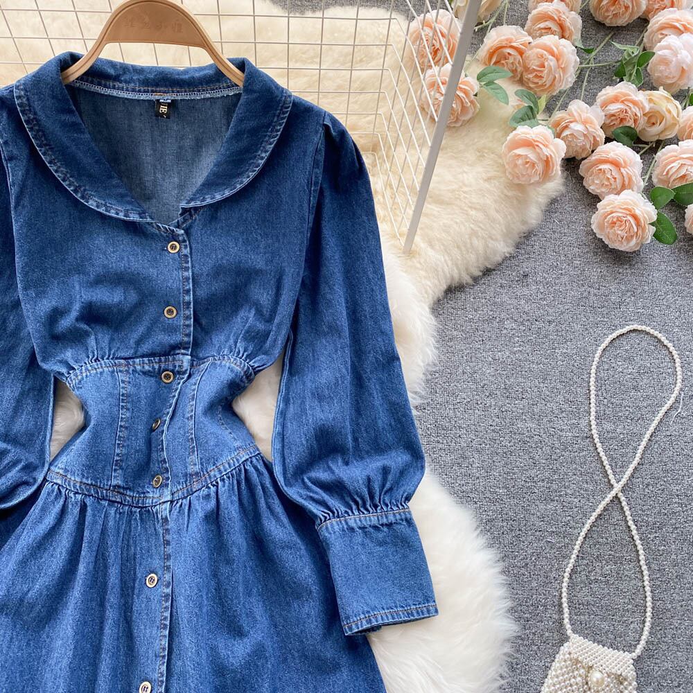 フランスの女性の気質レトロな文学デニムドレスウエストは薄いパフスリーブメッシュステッチ大スイングドレスです lyxaj7383767320