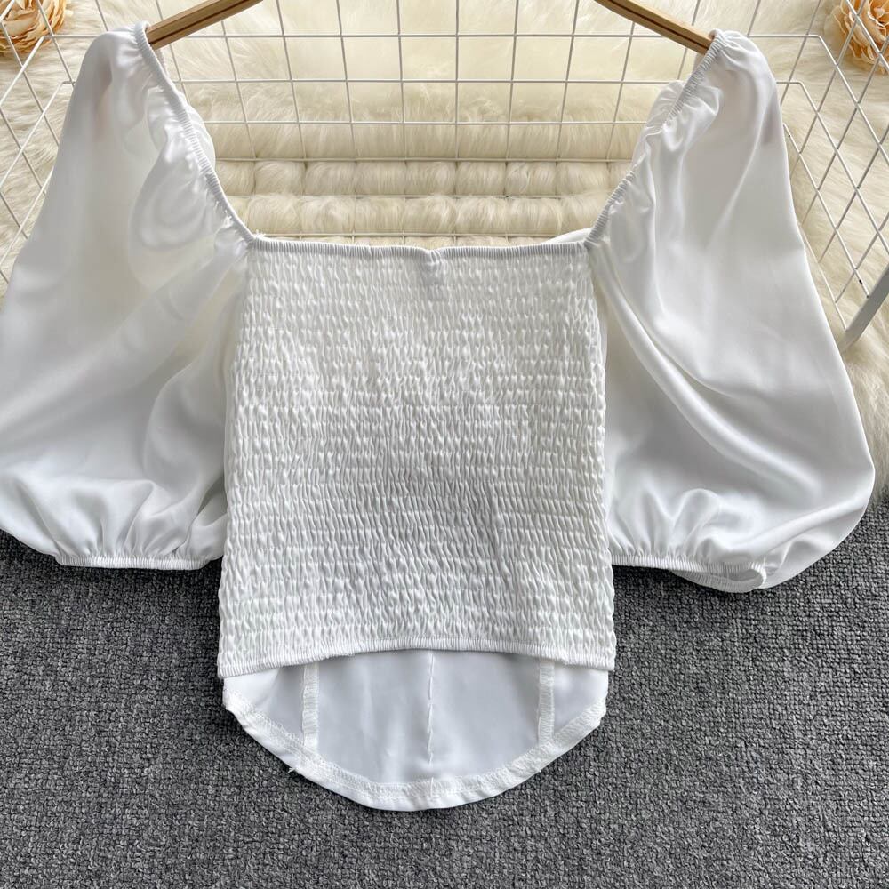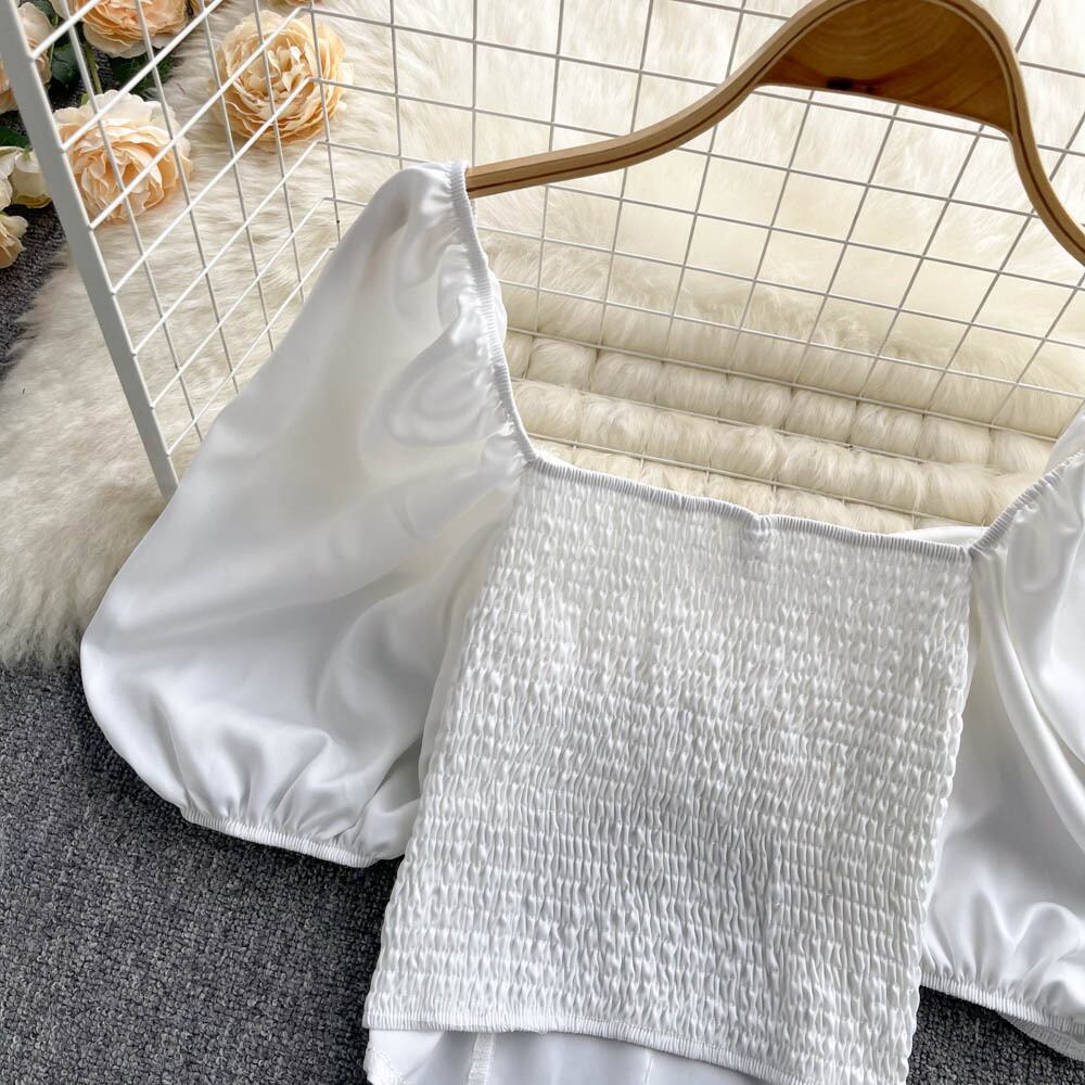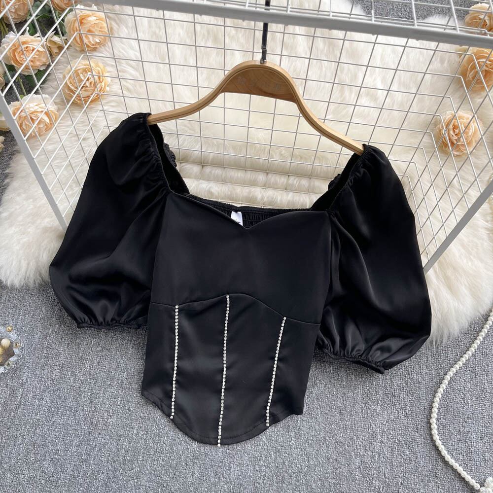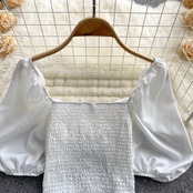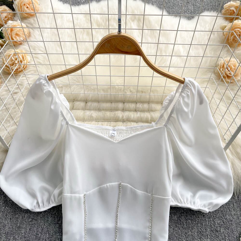 夏の新しいスタイルのバブル半袖の小さな正方形の襟のウエストスリムなデザインのチェーントップの女性のへそシックなシャツ サマー 夏物 スクウェア lyxaj26153702105