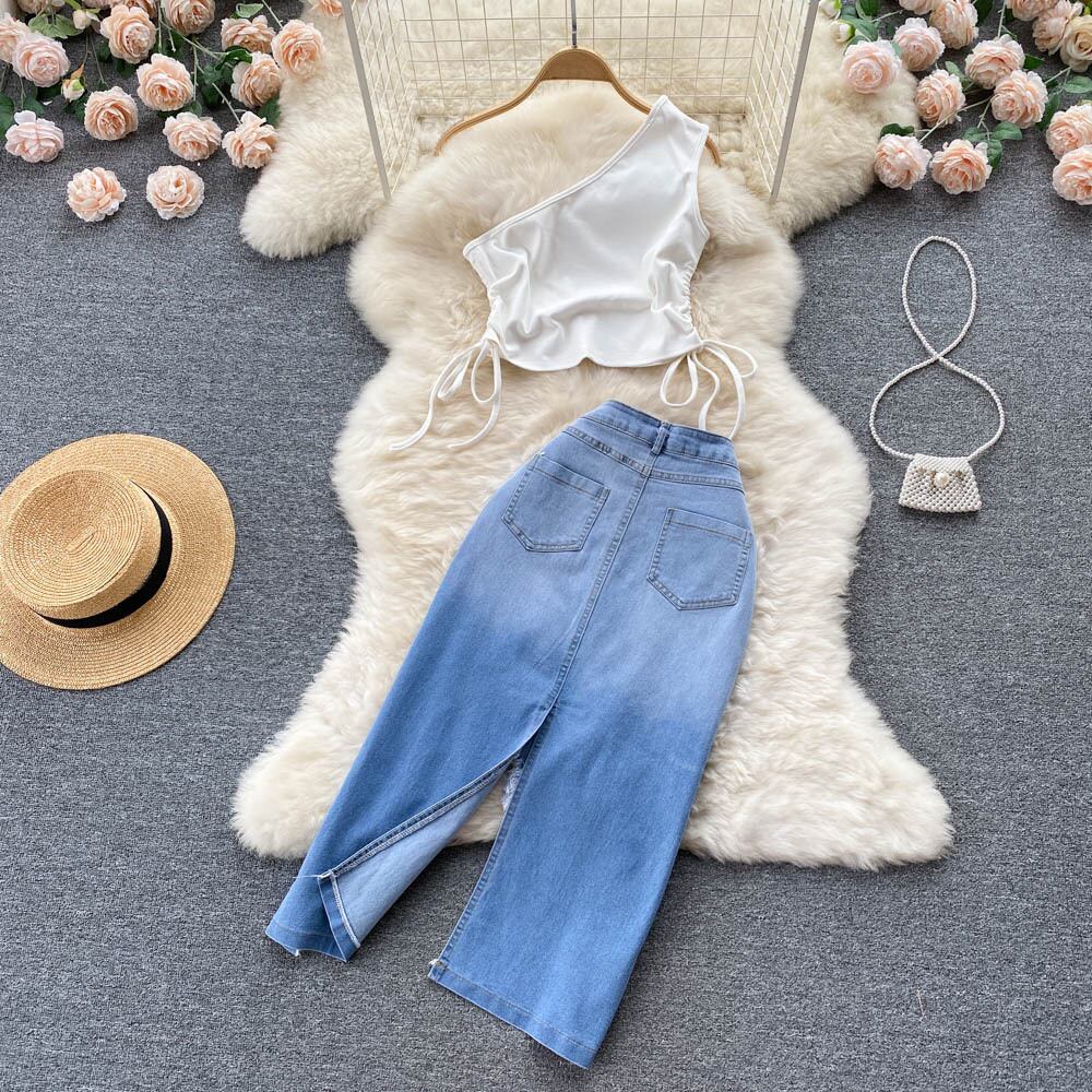 ホットガールサマースーツレディーススモックレーススモックショルダーベストイレギュラーローエッジスリットデニムスカートツーピース 夏物 lyxaj46435071519