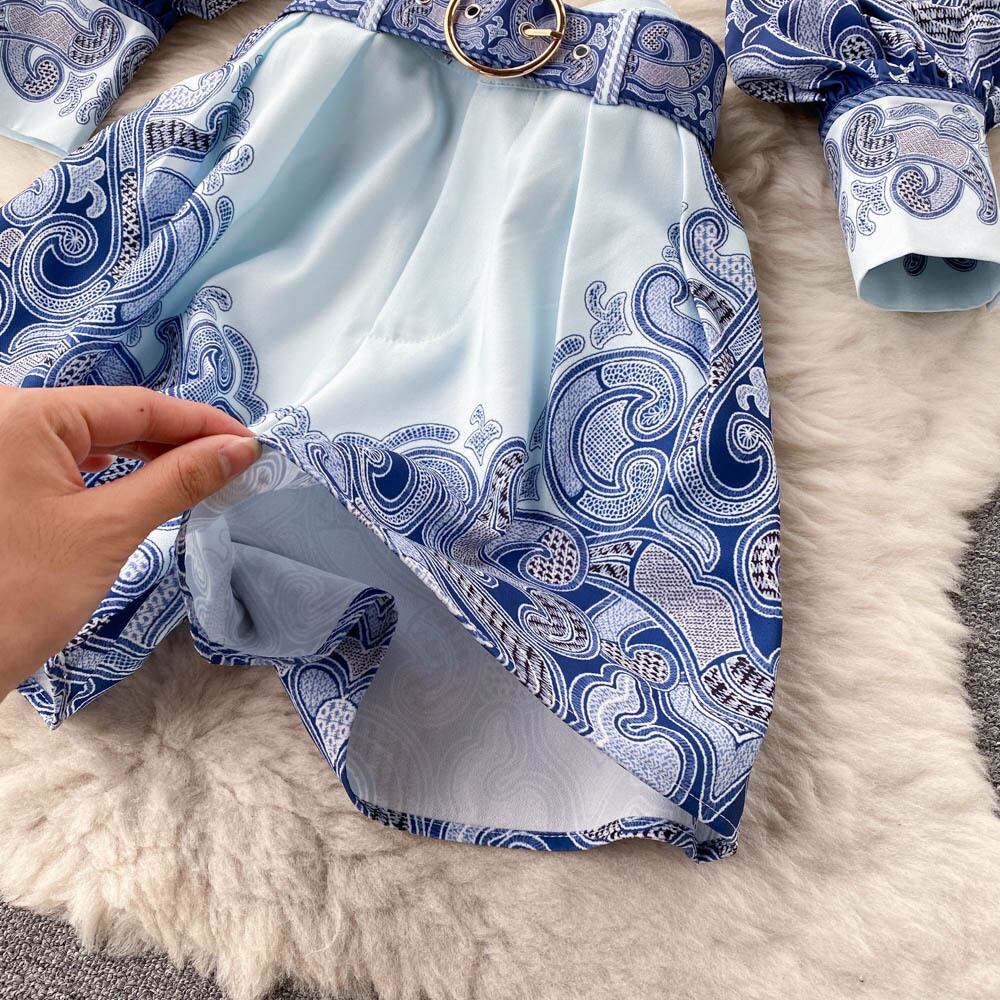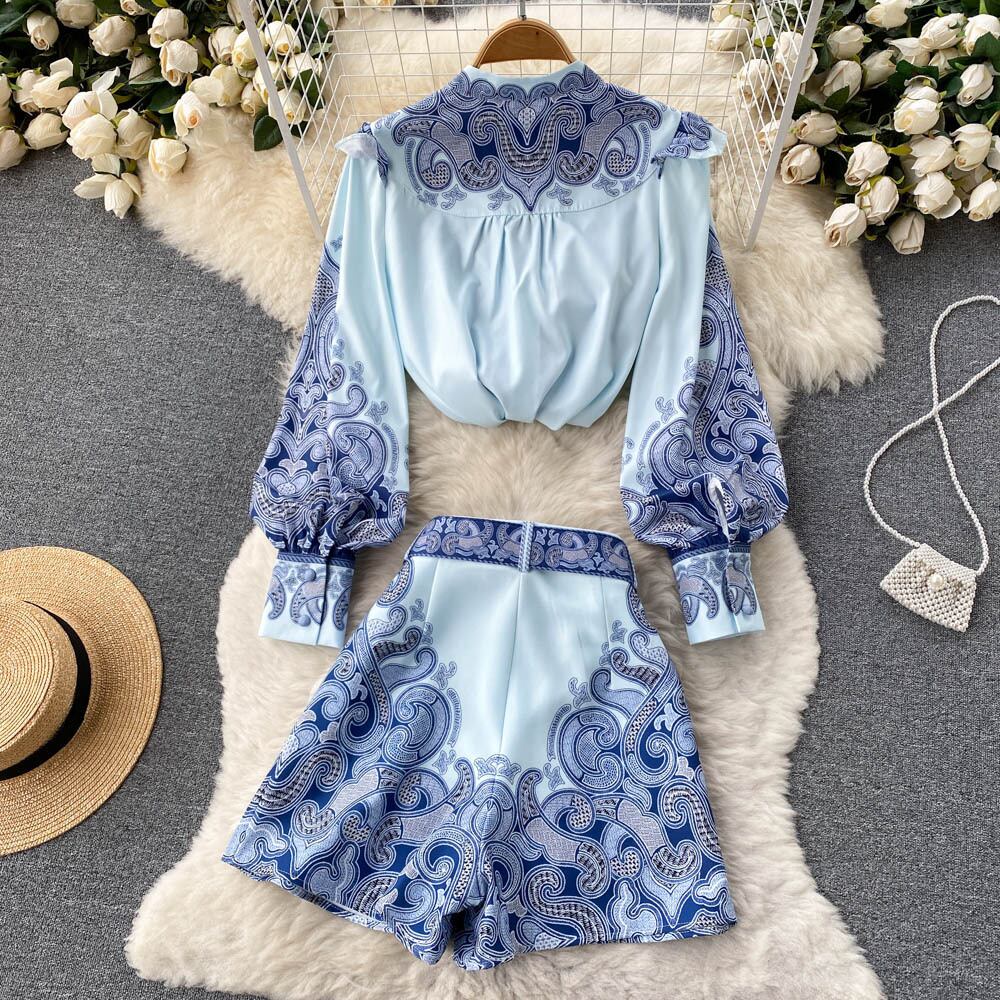 フレンチレトロプリントスーツ女性2022年春夏Vネックフリル長袖シャツ+ワイドレッグショーツツーピースセット ロング スプリング 春物 サマー 夏物 ブルマー lyxaj67175205897