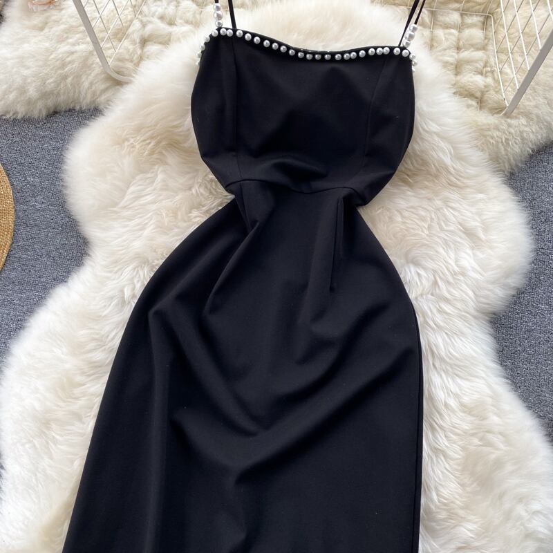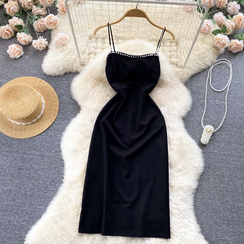 フレンチニッチ気質レディースパールステッチサスペンダースカートヘップバーンスリムウエストミドル丈ワンピースリトルブラックドレス 真珠 lyxaj63898263245