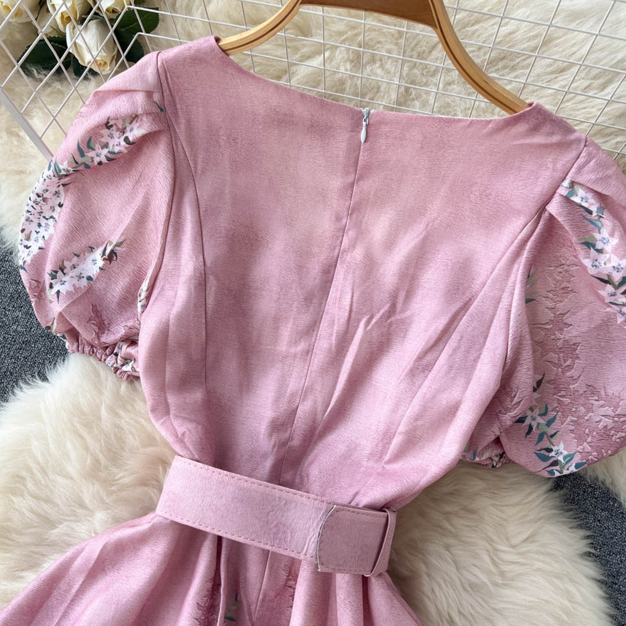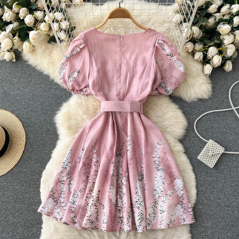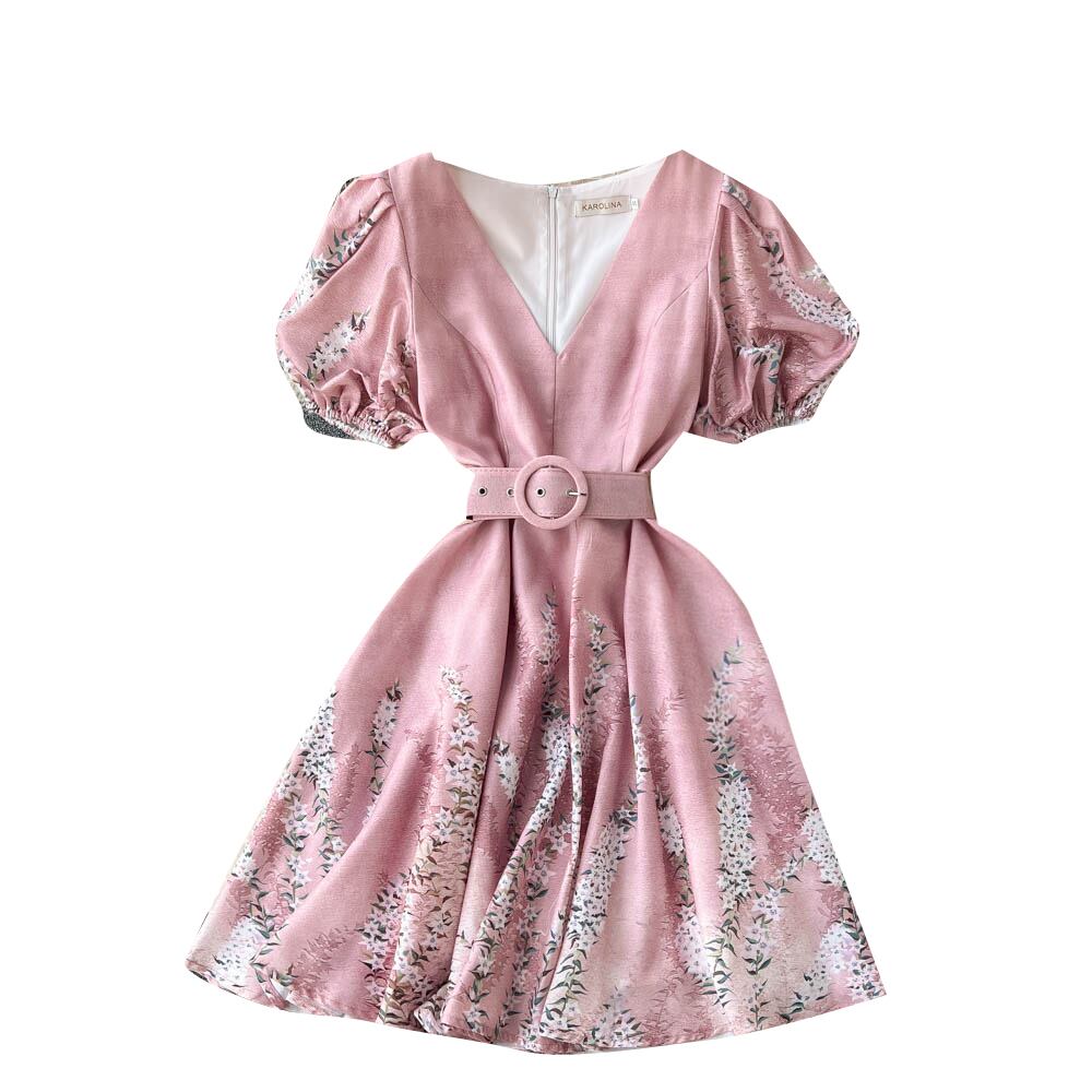夏の新作スリミングと優しいスタイルのVネックスカートレディースウエストウエスト気質ミドル丈フローラルワンピーストレンディ サマー 夏物 花柄 lyxaj64032605828