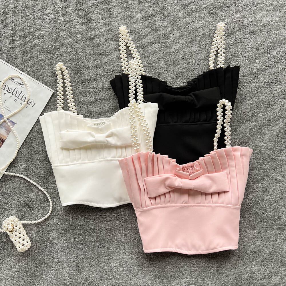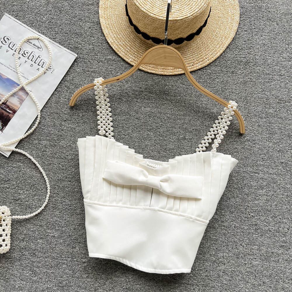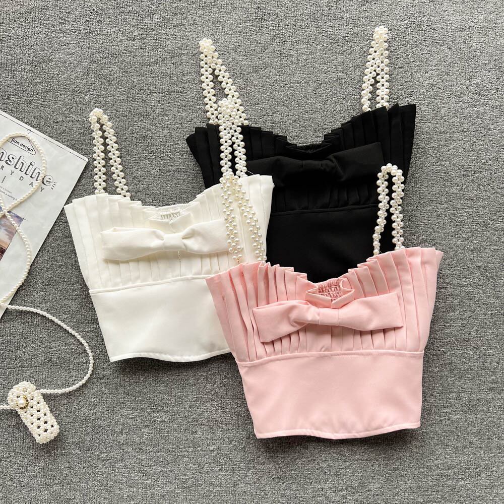 ビーズベストサスペンダーレディースアウターデザインセンス立体ボウシェルスリムフィットとスリムノースリーブショートトップトレンディ リボン lyxaj70713789473