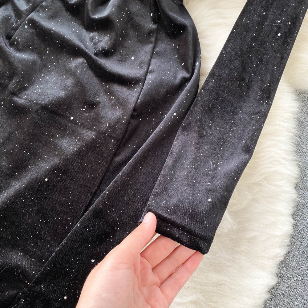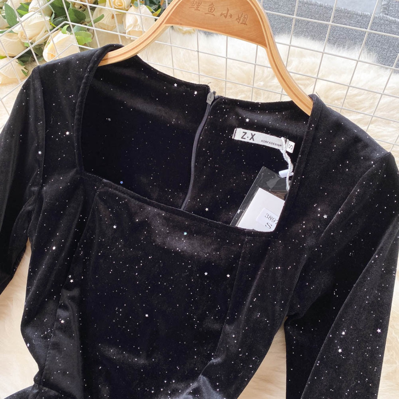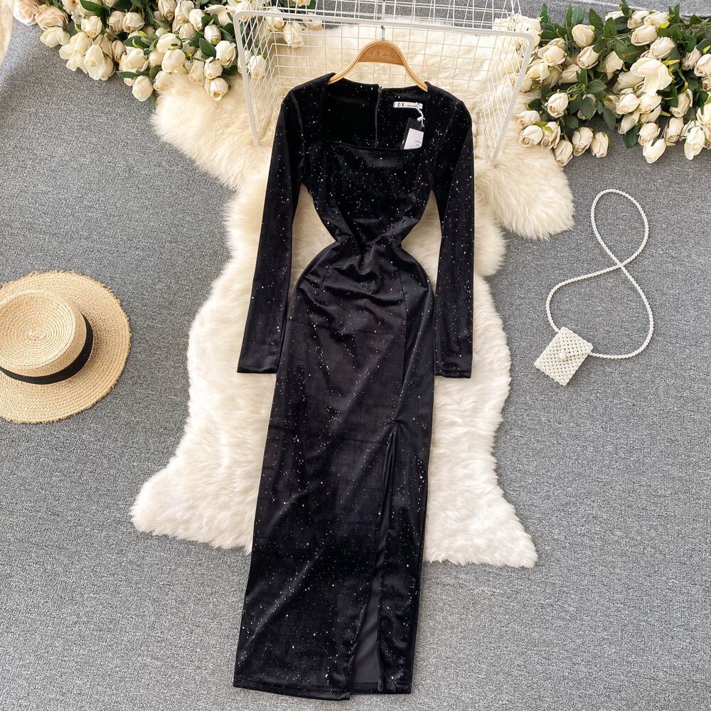 セレブスタイルの高級ドレスフレンチレトロベルベットドレススカート気質スリットバッグヒップスクエアカラーウエストロングスカート スクウェア lyxaj57012538379
