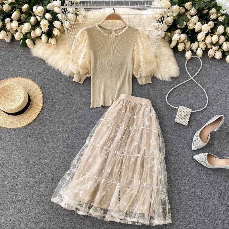 パレススタイルのパフスリーブニットトップ女性のレトロな重工業刺繍フェアリースカート甘くて年齢を減らすツーピーススーツ女性の夏 レース 大人ガーリー スウィート キュート カジュアル サマー 夏物 lyxaj69481389085