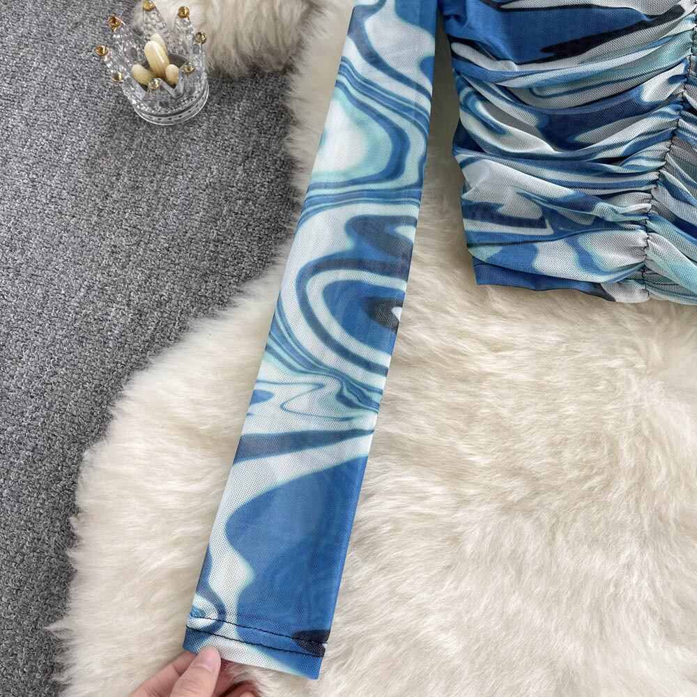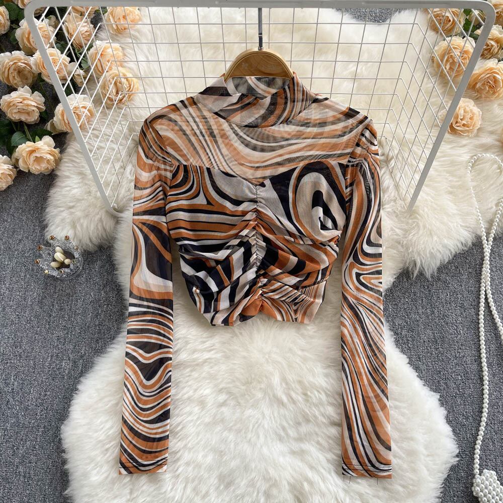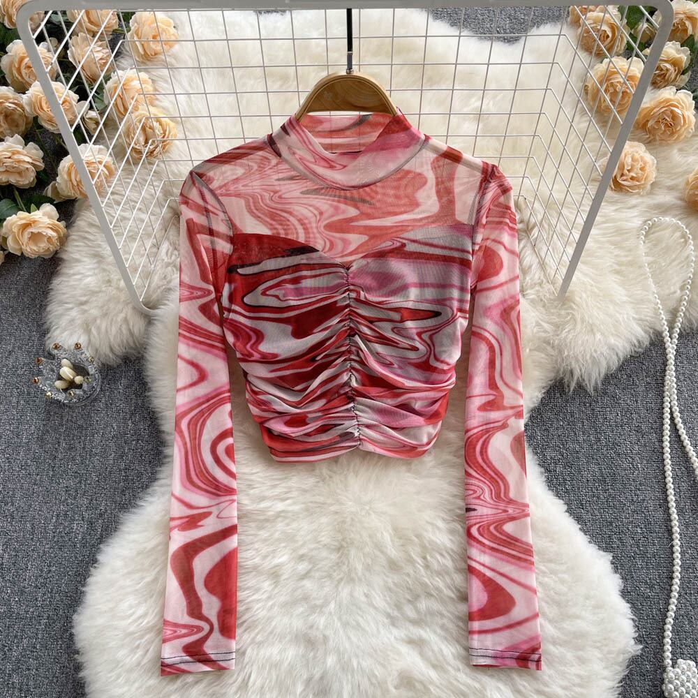 しわの寄った薄いメッシュハイネックハイネックショートへそセクシーなヨーロッパとアメリカのインスリムフィット長袖ボトミング外国風トップス ロング ヨーロピアン lyxaj3859454273