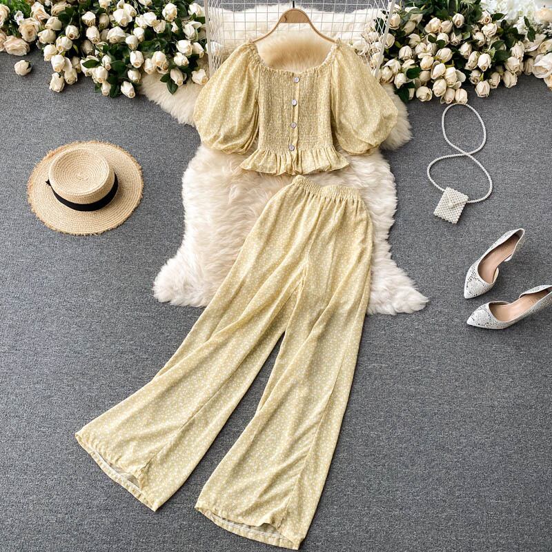 年齢を減らして痩身スーツの女性のサマードレスウエスタンスタイルのパフスリーブショートトップオールマッチハイウエストワイドレッグパンツフローラルツーピースセット ハイウェスト 夏物 花柄 ワイドパンツ lyxaj50387899689