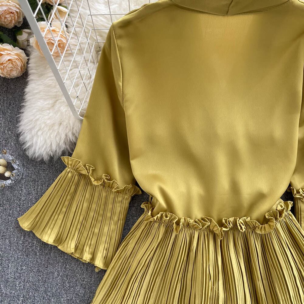 ヨーロッパとアメリカの気質Vネック7ポイントベルスリーブウエストネクタイは、薄いワンピースの頑丈なプリーツシャツトップの女性を示しています ヨーロピアン lyxaj45648738884