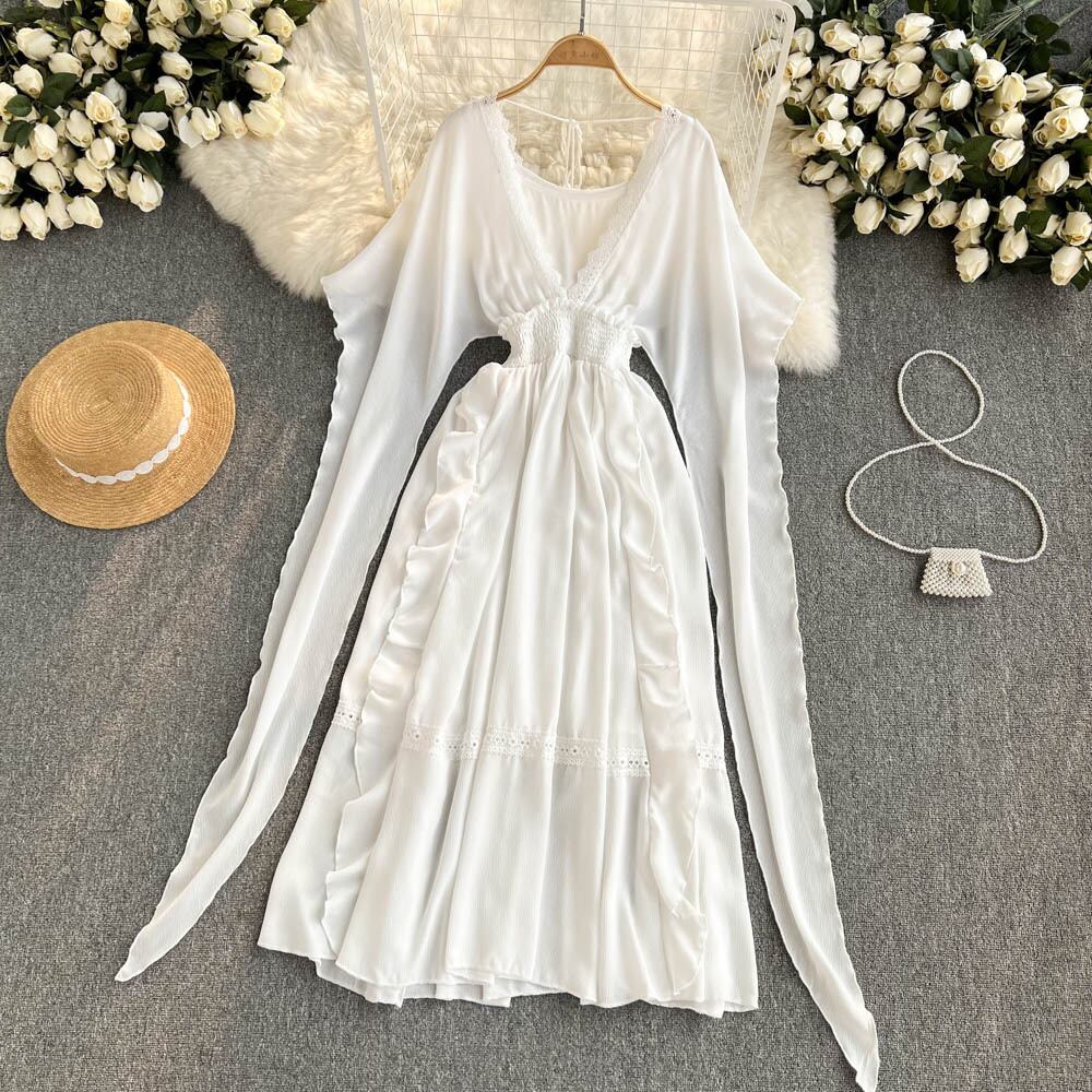 シーサイドホリデービーチドレススーパーフェアリー気質Vネックウエストスリムデザインシフォンドレスベストツーピースセット lyxaj21026365277