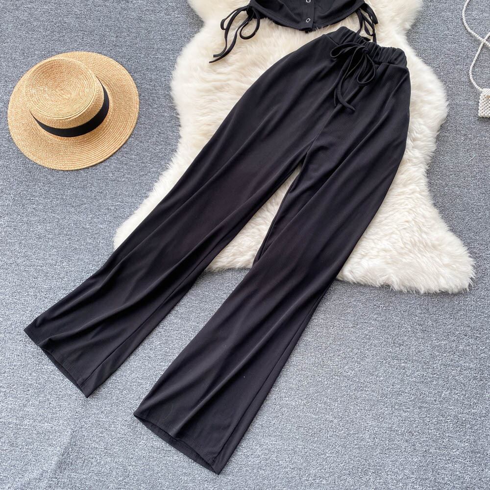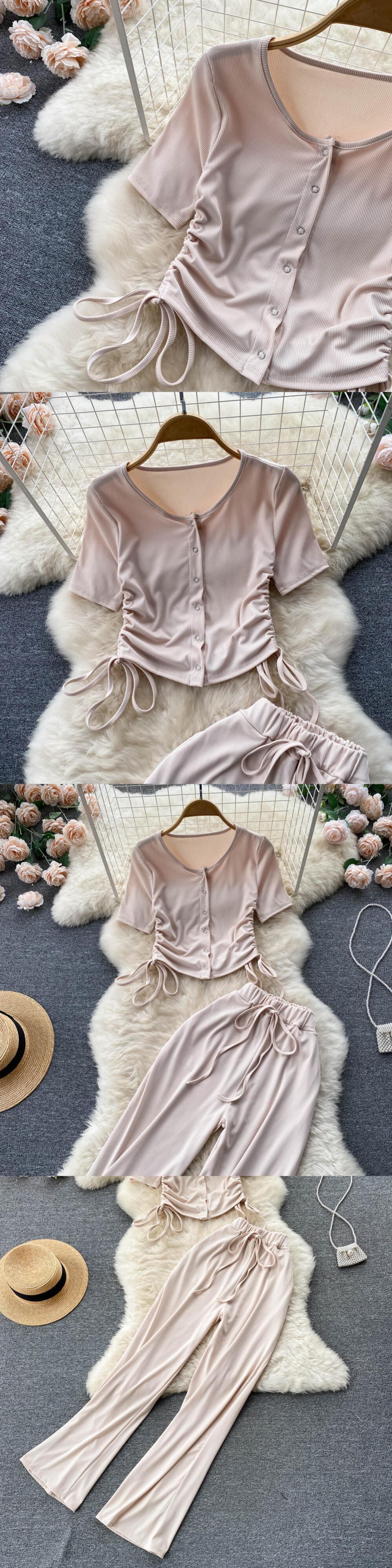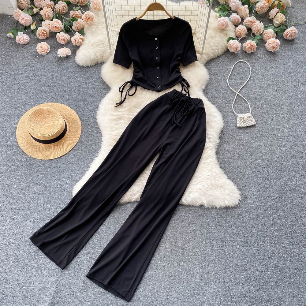 優しいスタイルのファッションスーツ女性の夏のプリーツレースショートトップ+ハイウエストドレープカジュアルパンツツーピースセット ハイウェスト サマー 夏物 lyxaj66578885916