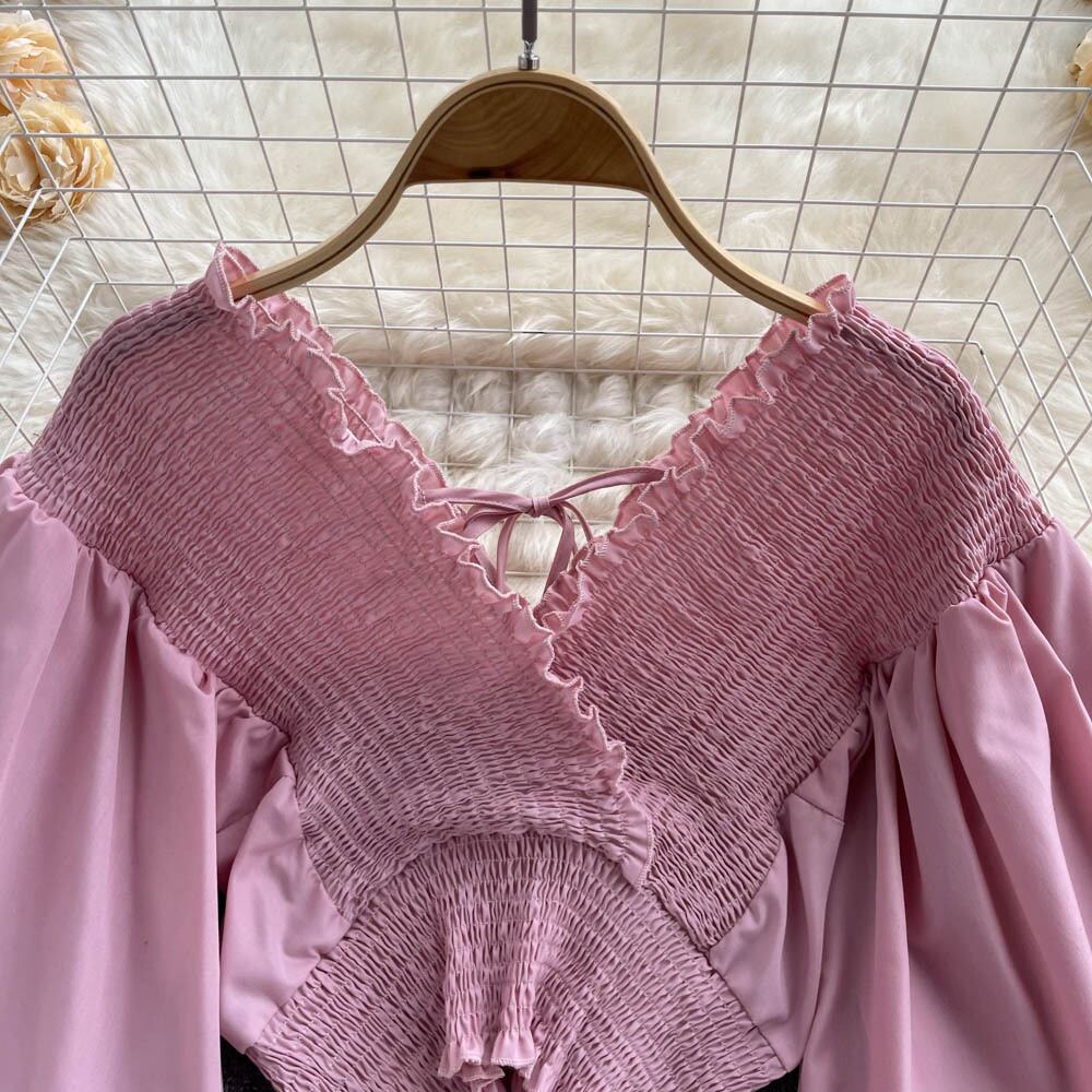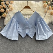 夏のフレンチパフスリーブワンワードネックショートスリムフィットデザインニッチクロスセクシースリムオールマッチシャツ女性 サマー 夏物 lyxaj94151415594