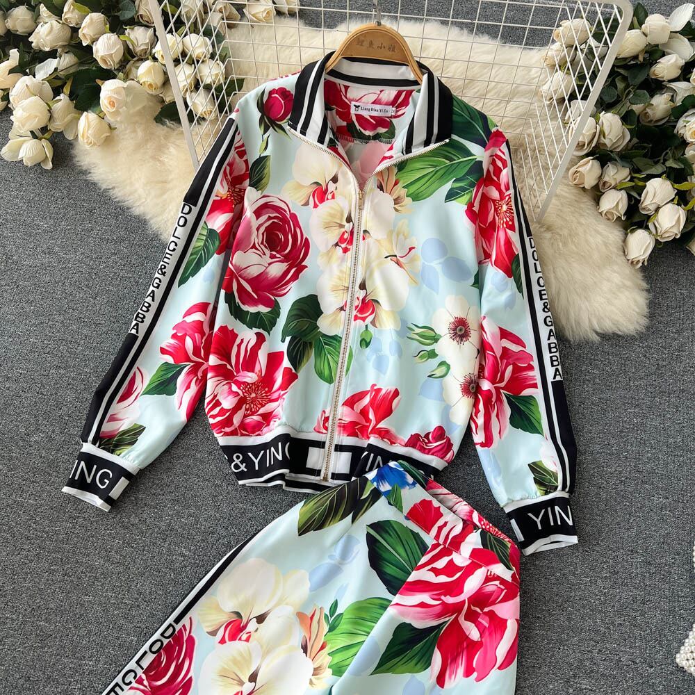 スポーツ・レジャースーツレディーススタンドカラー長袖洋風プリントジャケットジャケット野球ユニフォーム+パンツプリントツーピースセット ロング lyxaj40853266530