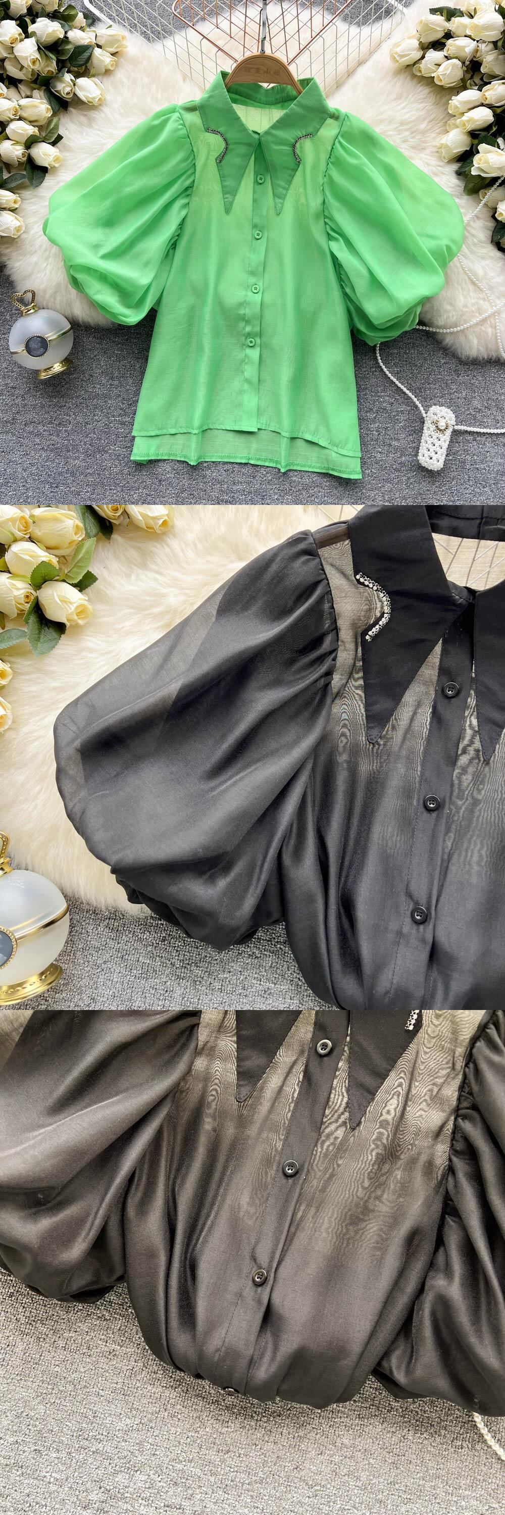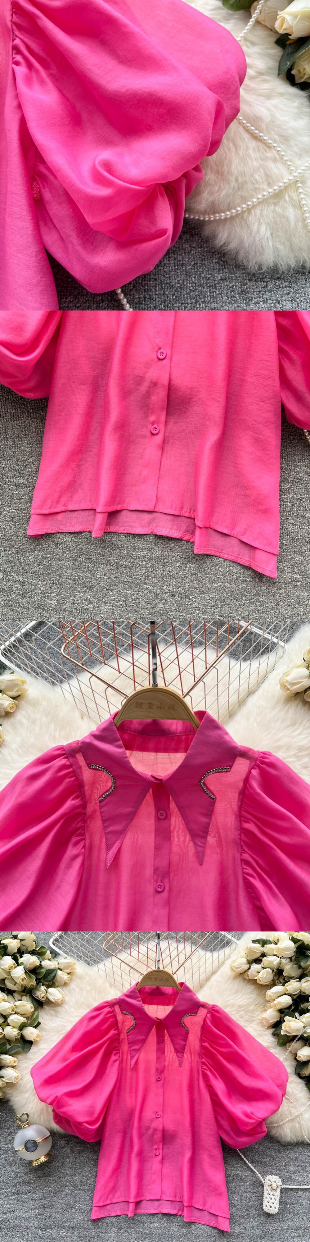 韓国のシックなフランスのレトロな香港スタイルの重工業ダイヤモンドをちりばめたシャツ女性のスリムな半袖の小さなシャツのパフスリーブのトップ lyxaj48936722614