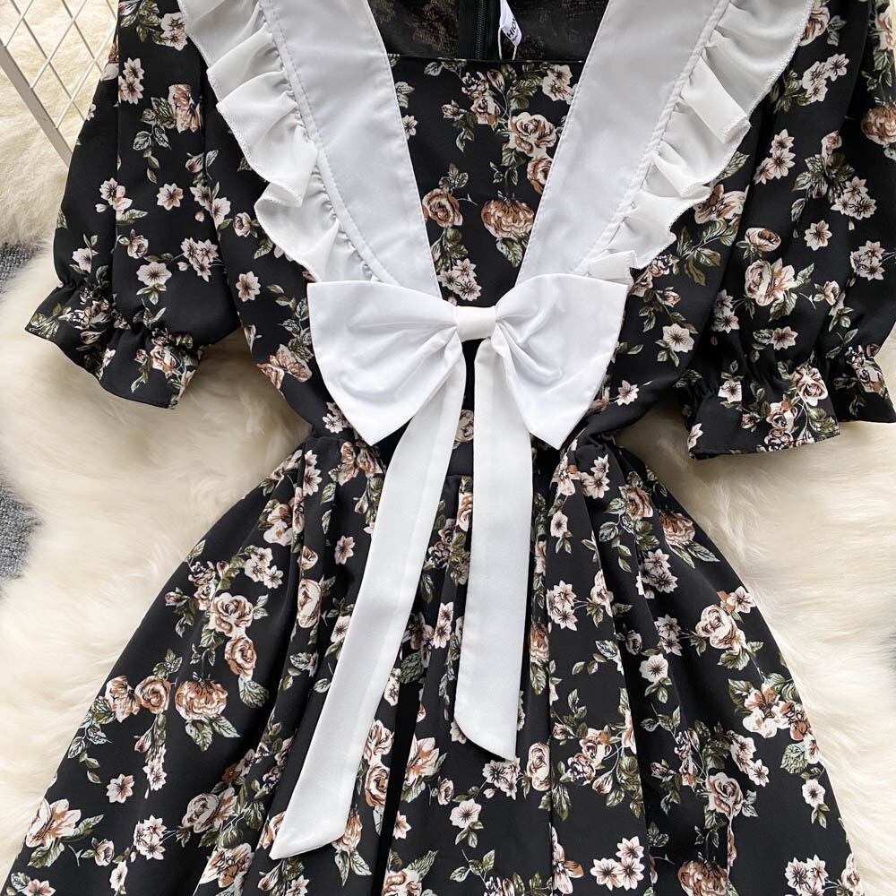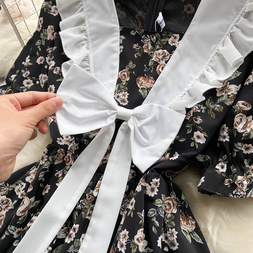夏の新作フレンチネイビーカラーカレッジスタイルボウフローラルドレスレディースハイウエストスリム気質スカートトレンディ ハイウェスト リボン サマー 夏物 花柄 lyxaj18802381990