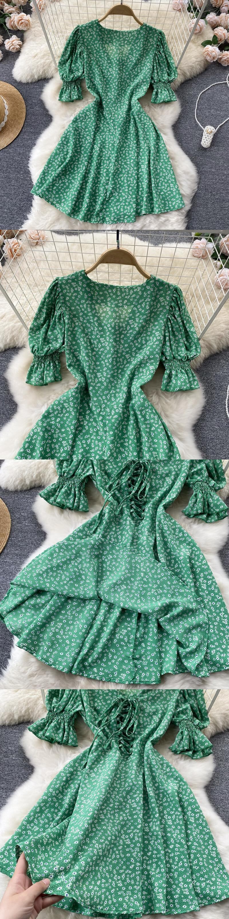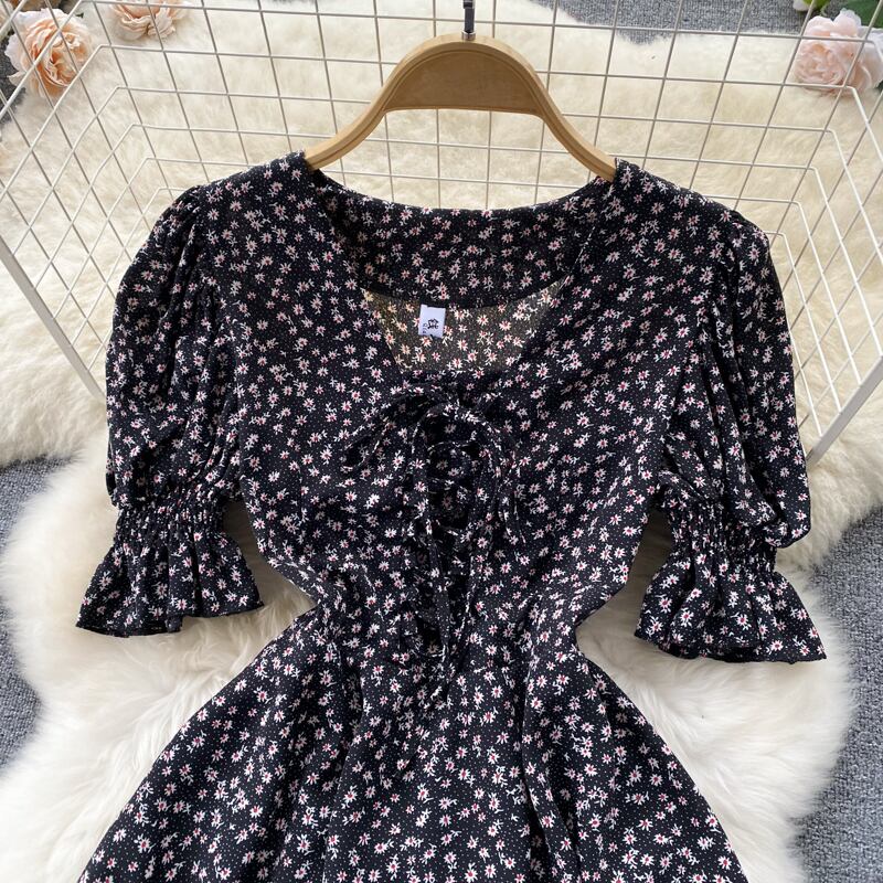 レトロな花柄のドレス2022年夏の新しい韓国バージョンのVネックストラップは薄いパフスリーブを示していますAラインのふくらんでいる短いスカート ショート サマー 夏物 lyxaj20993895546
