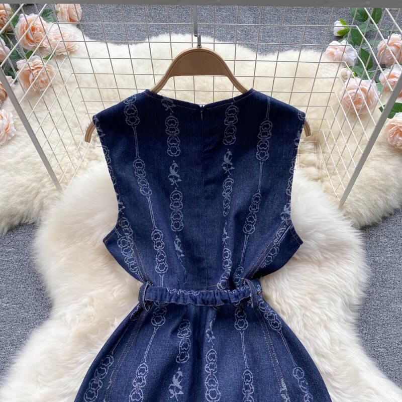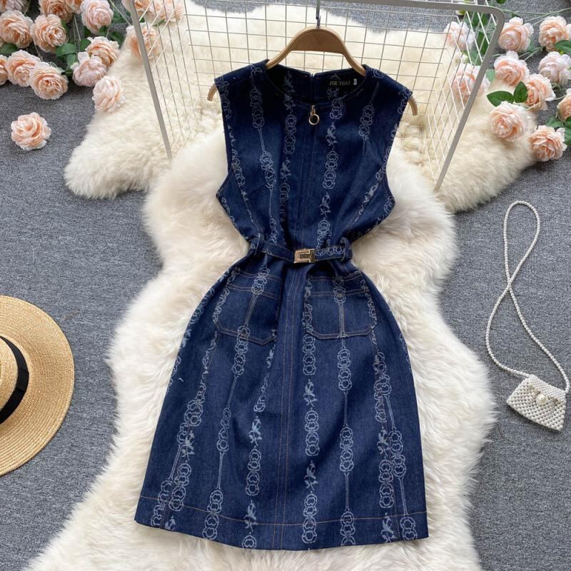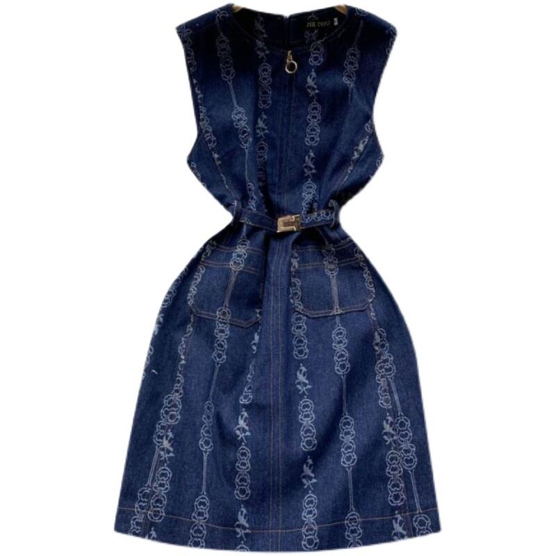 2022年春フェミニティレディース気質スリムフィットラウンドネックジッパーノースリーブヒップデニムジャカードドレス スプリング 春物 Oネック lyxaj72508549968