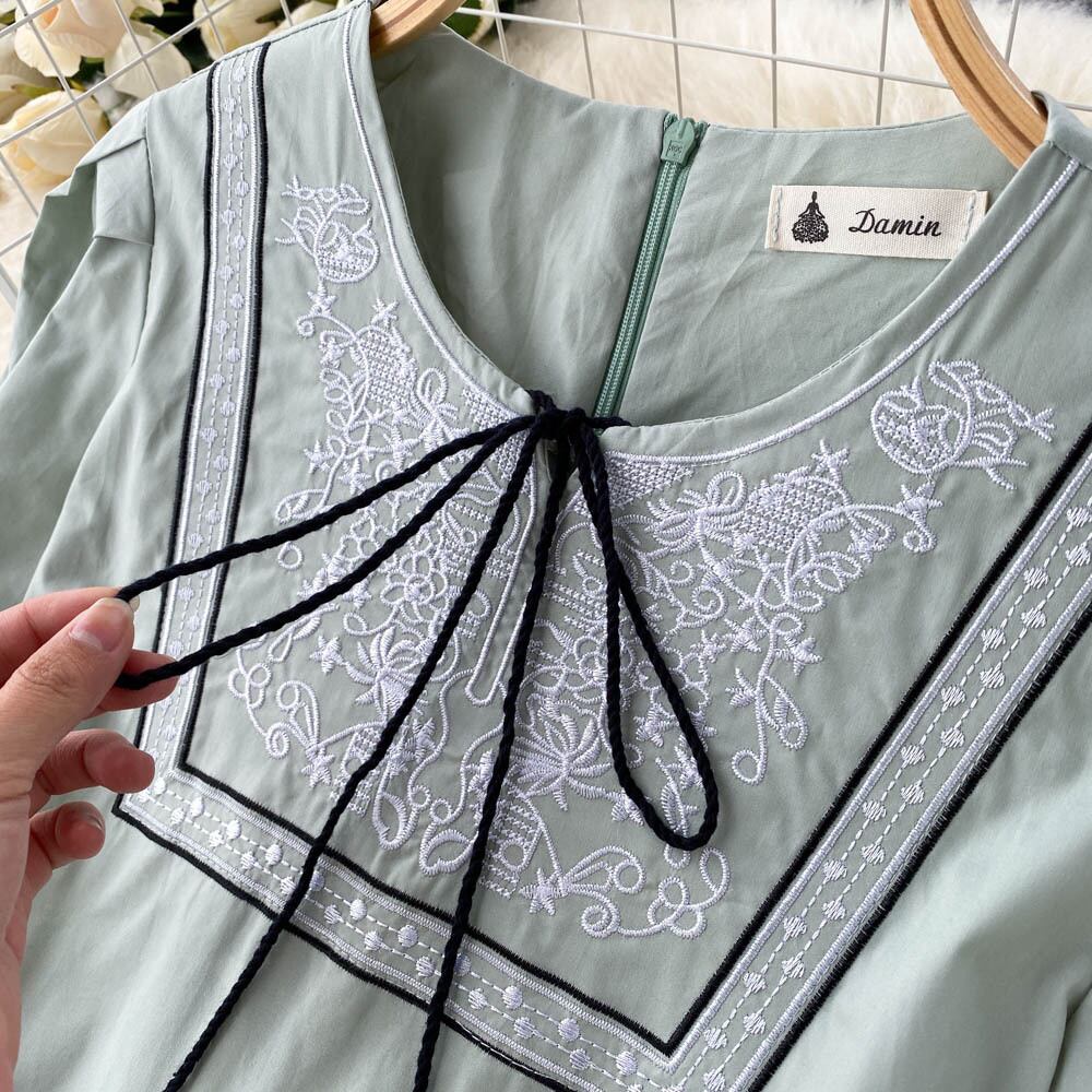 レトロな文学カジュアルルーズドレス女性の2022年夏の新しい絶妙な刺繡ミドル丈半袖Aラインスカート 刺繍 サマー 夏物 lyxaj65462994727