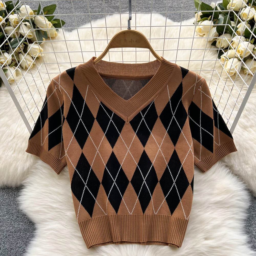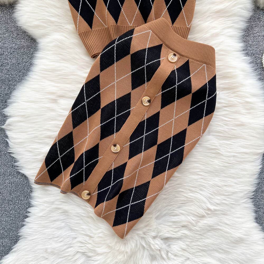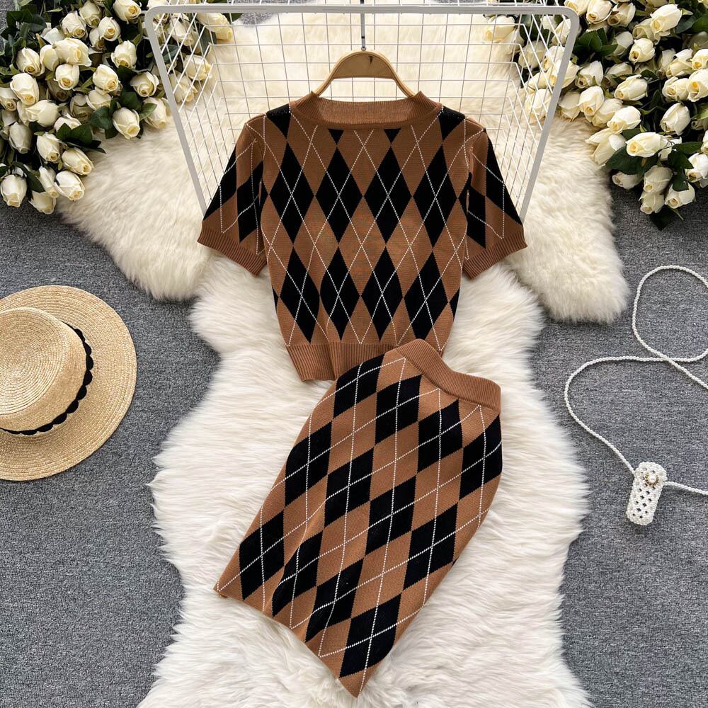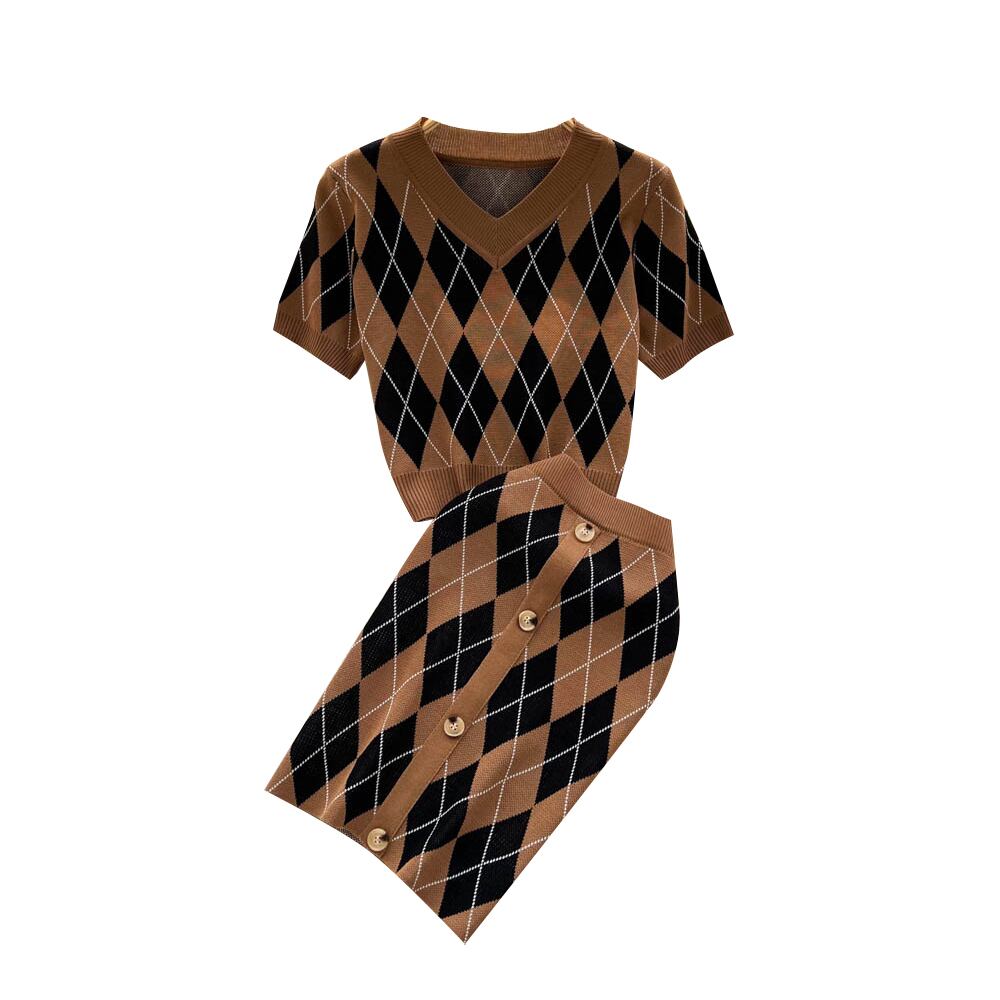 春夏新作韓国版レトロダイヤモンドVネック半袖ニットトップレディースボタンヒップスカートツーピーススーツ スプリング 春物 サマー 夏物 lyxaj2407841156