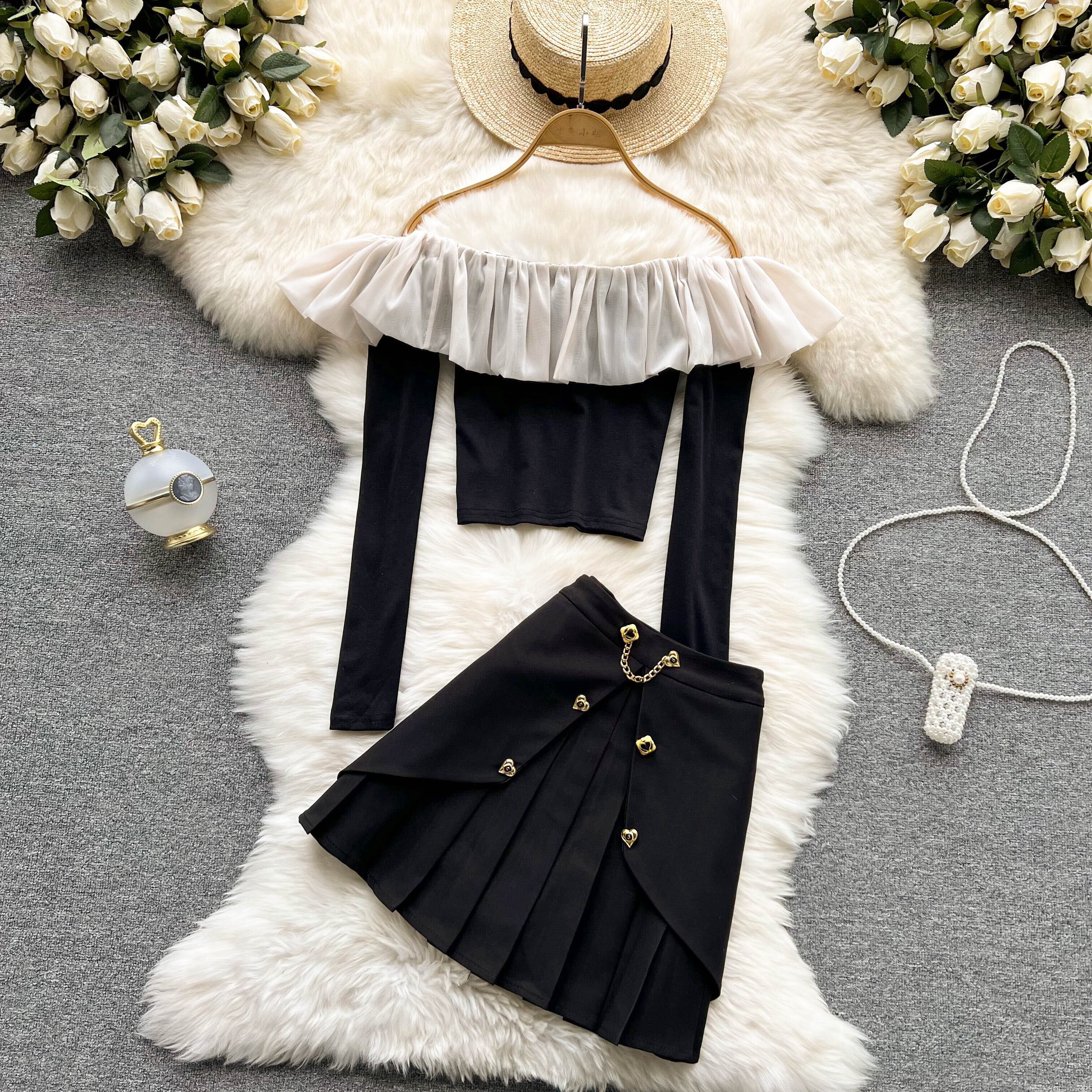 フリルワンショルダーメッシュシフォンステッチショートトップレディースニッチボタンプリーツスカートツーピーススーツトレンディ lyxaj95174518080