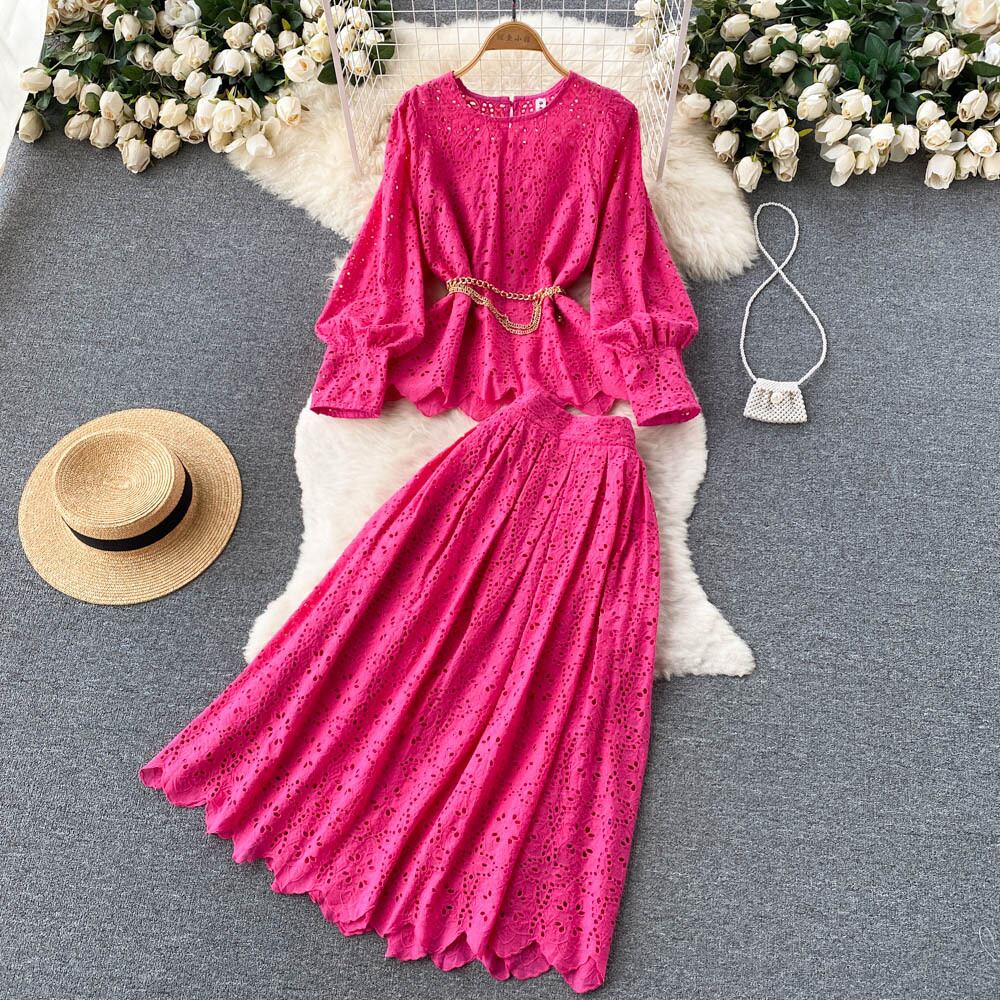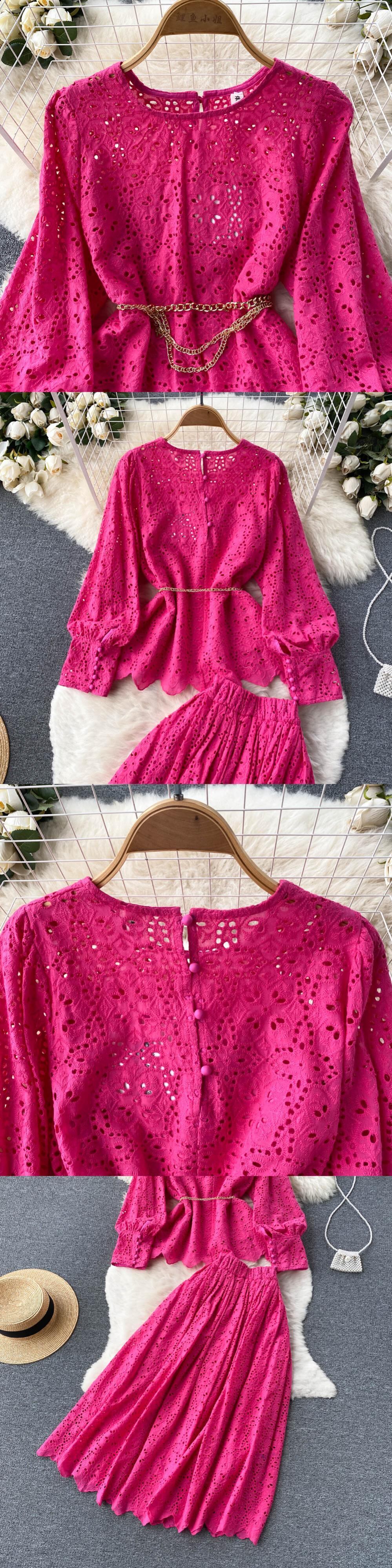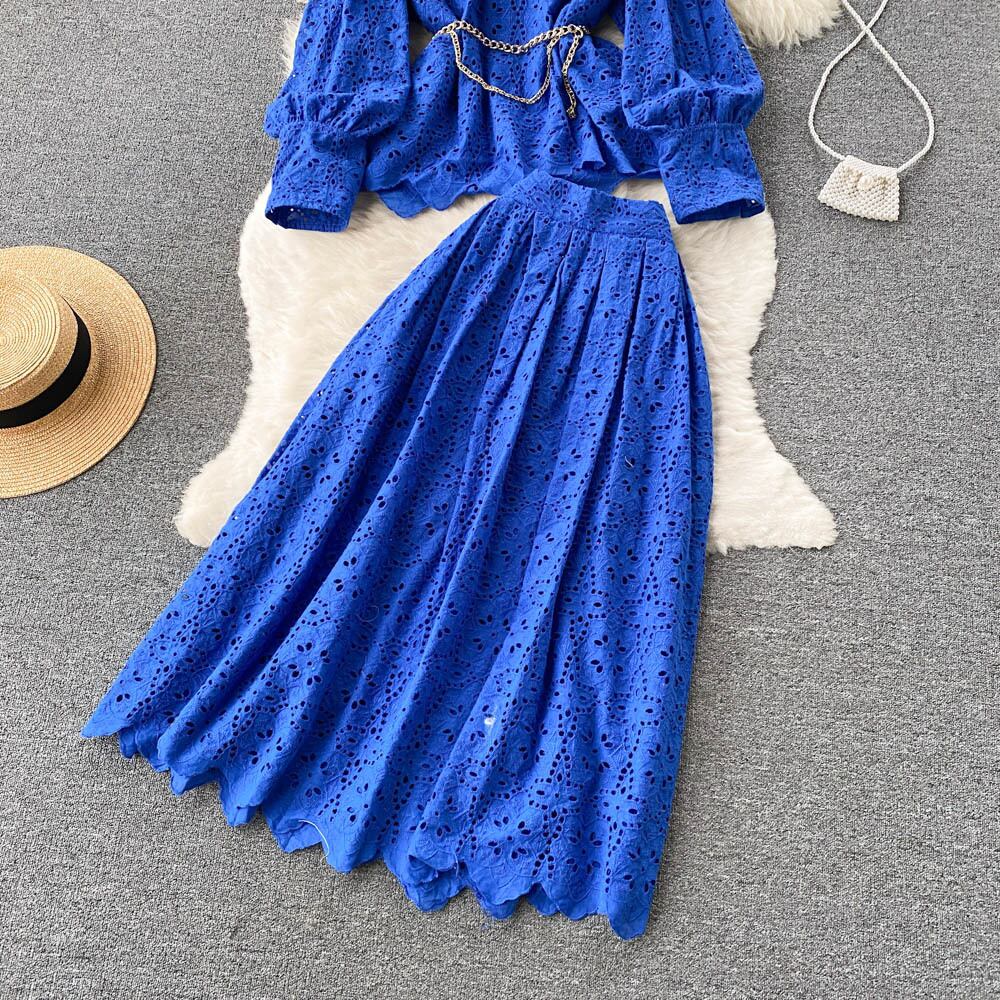 フランスの優しい風レトロ中空レーススーツヨーロッパとアメリカのins女神気質ウエストトップ+プリーツスカート ヨーロピアン lyxaj60841679794