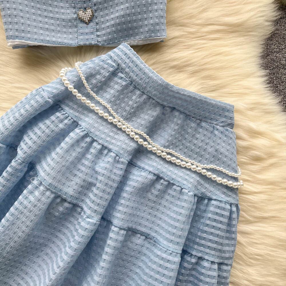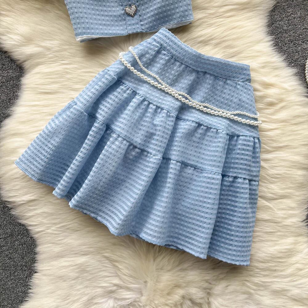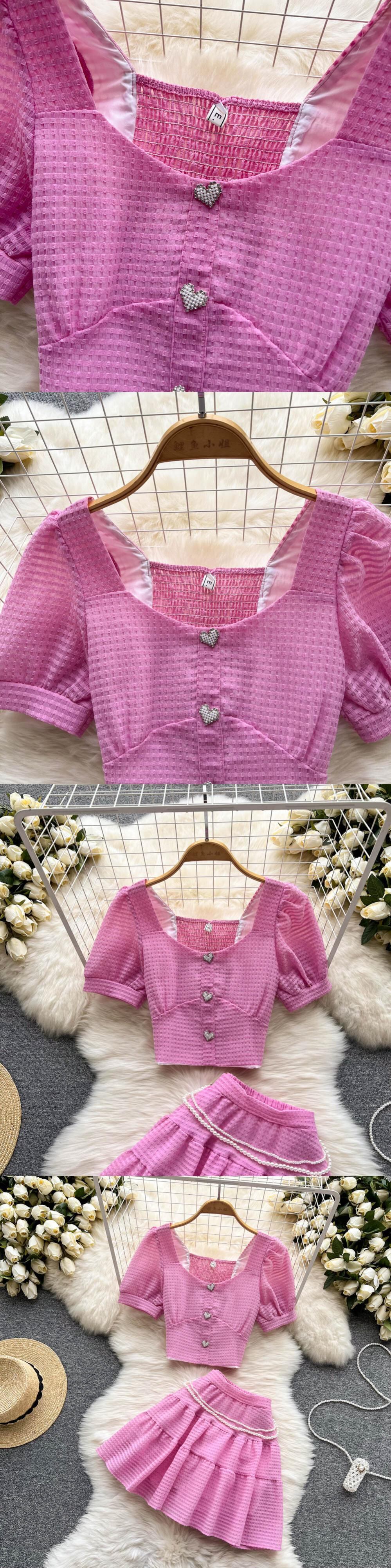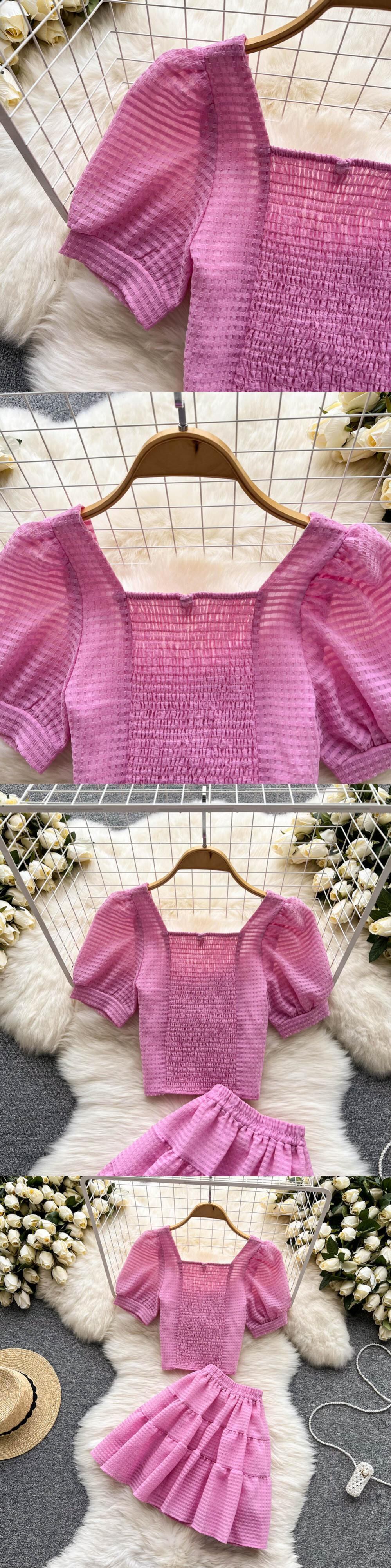 甘くてピュアな年齢を減らすスーツの女性の夏の新しいスリムなショートパフスリーブトップ+ハイウエストスカートツーピースセット ハイウェスト 大人ガーリー スウィート キュート カジュアル サマー 夏物 lyxaj47130130231