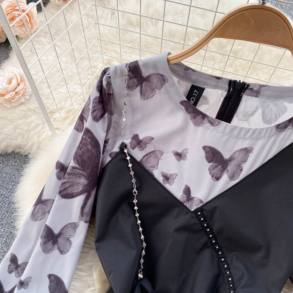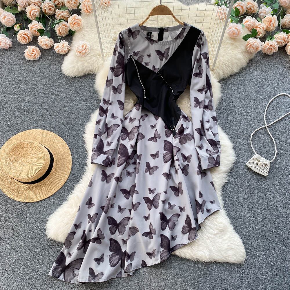 2022年初春の新しいレトロなフェイクツーピースバタフライプリントステッチ不規則なスカートドレスルーズロングスカート スプリング 春物 lyxaj71432064679