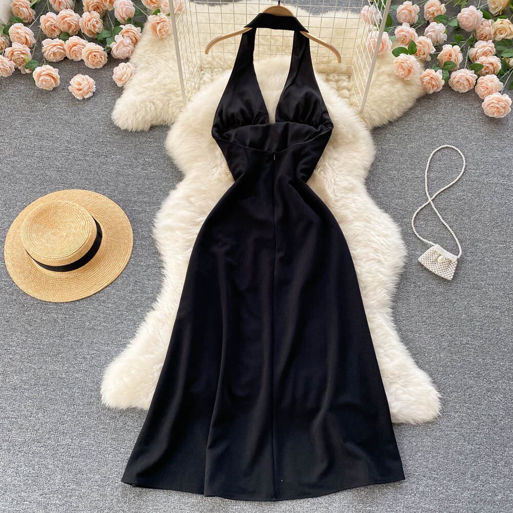 フランスのレトロなヘップバーンブラックハイエンドセクシーでセクシーなVネックスプリットオープンバックホルタードレススーパーフェアリーホリデードレス lyxaj46853620900