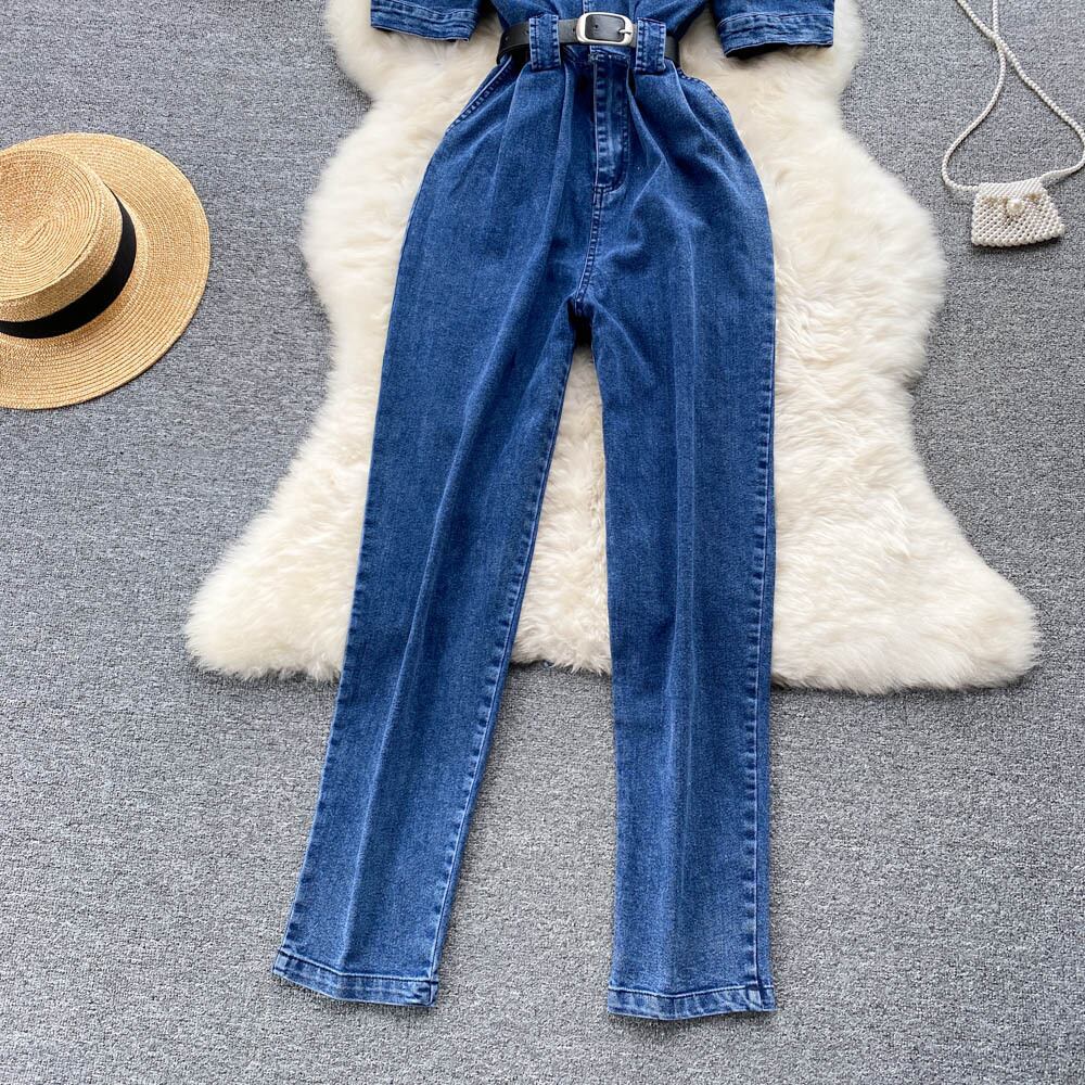レトロなツーリングスタイルのスクエアカラーワイドレッグジャンプスーツレディース半袖ポケットルーズウエストシンデニムジャンプスーツパンツ スクウェア lyxaj80836504816