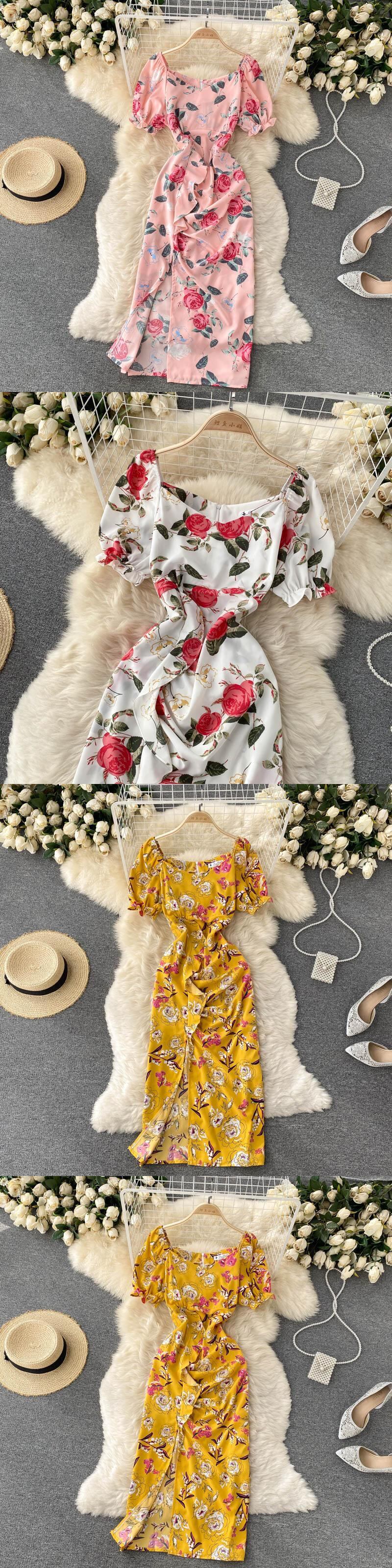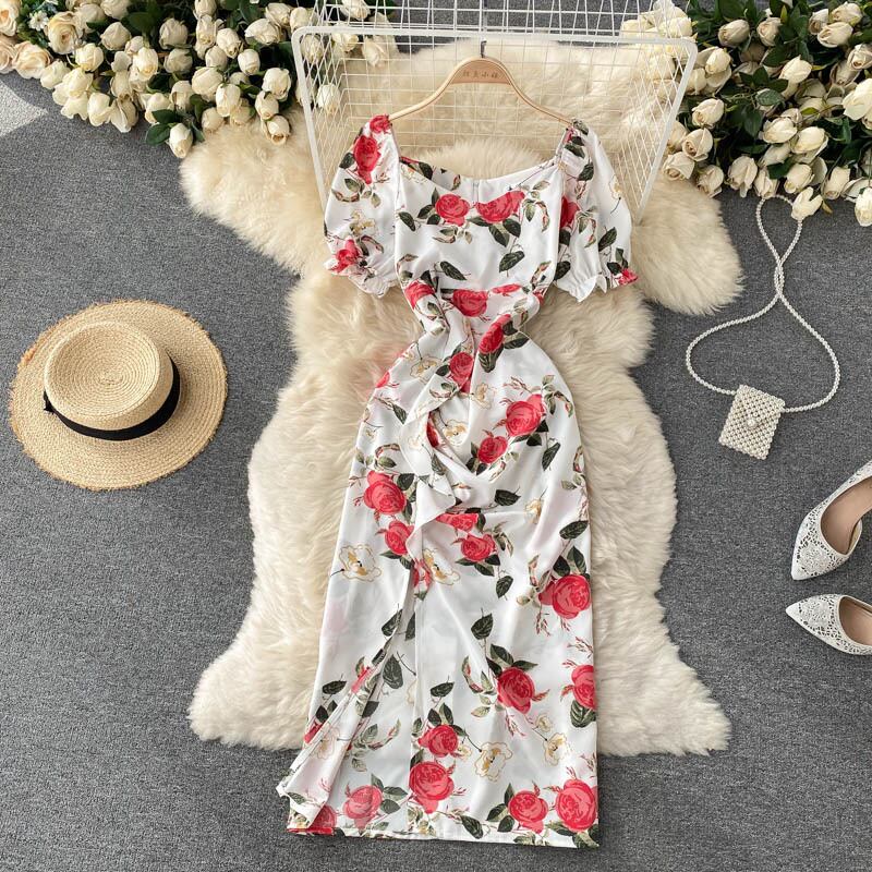 セレブXiaoxiangfengレトロプリントプリーツ半袖ドレス女性ウエスタンスタイルスリムで薄い気質スプリットバッグヒップスカート lyxaj65507227018