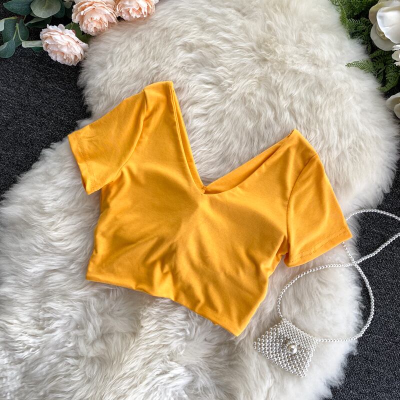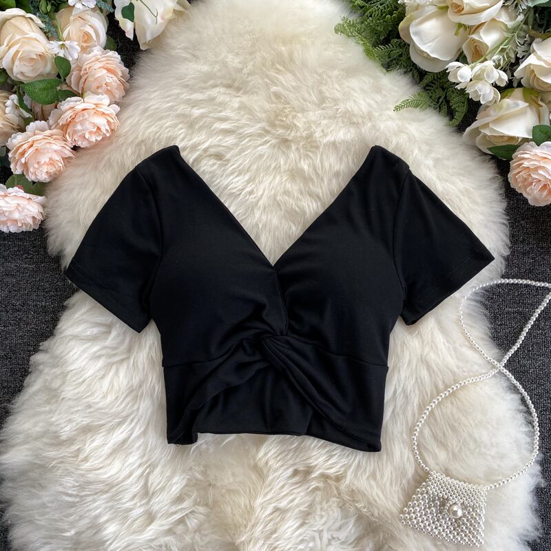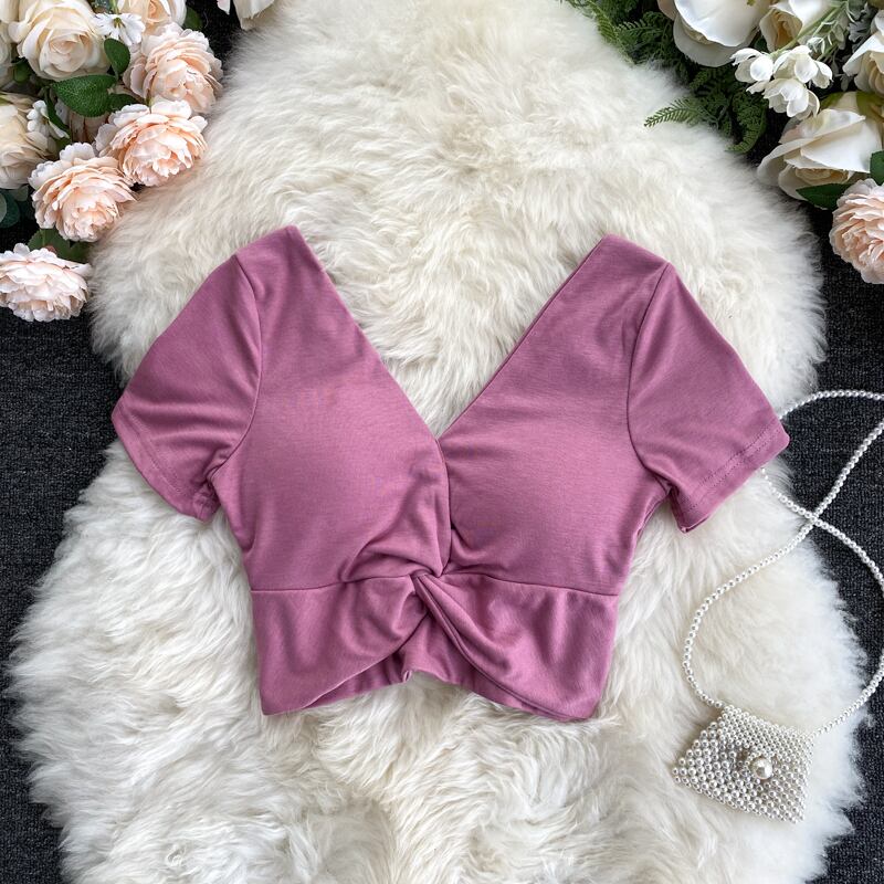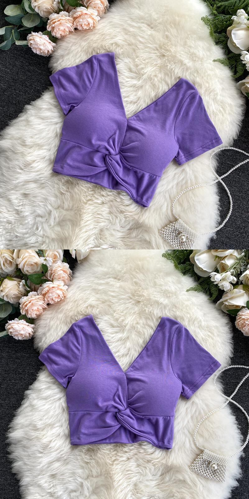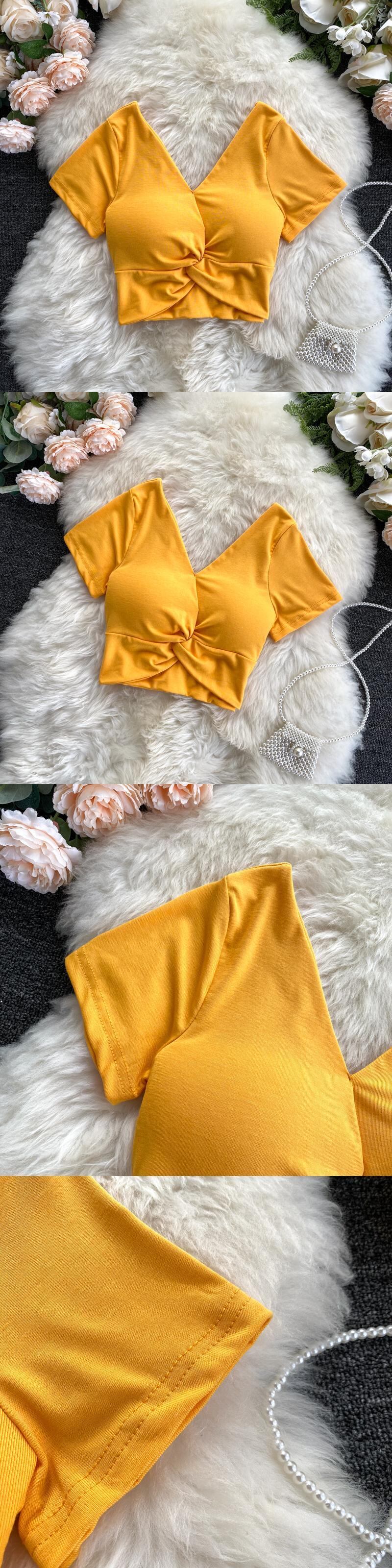 2020年の新しいシックな香港風味のファッション無地Vネック半袖デザインはハイウエストの短い押し出しTシャツトップを結びました ショート ソリッドカラー lyxaj37866922210