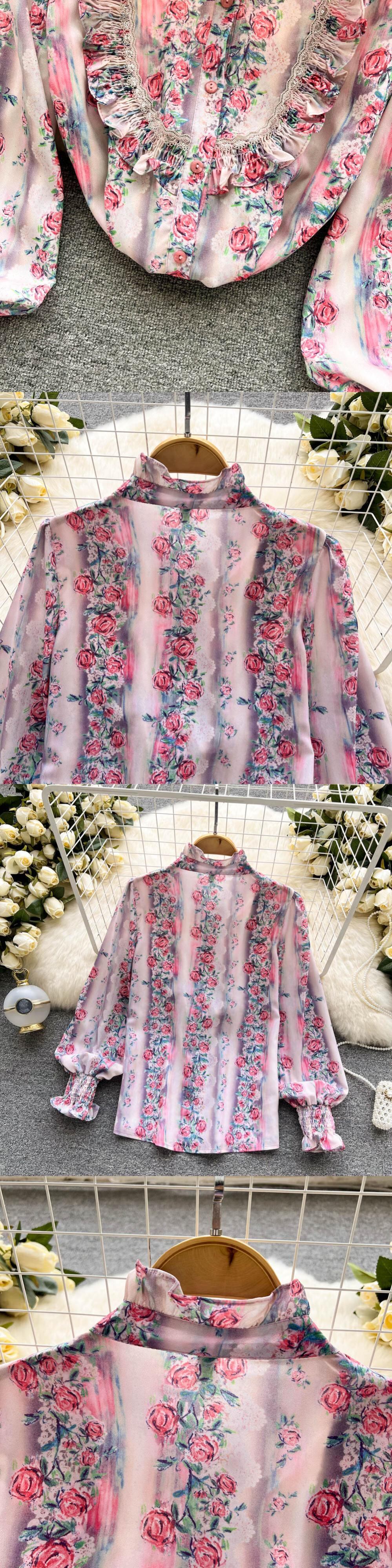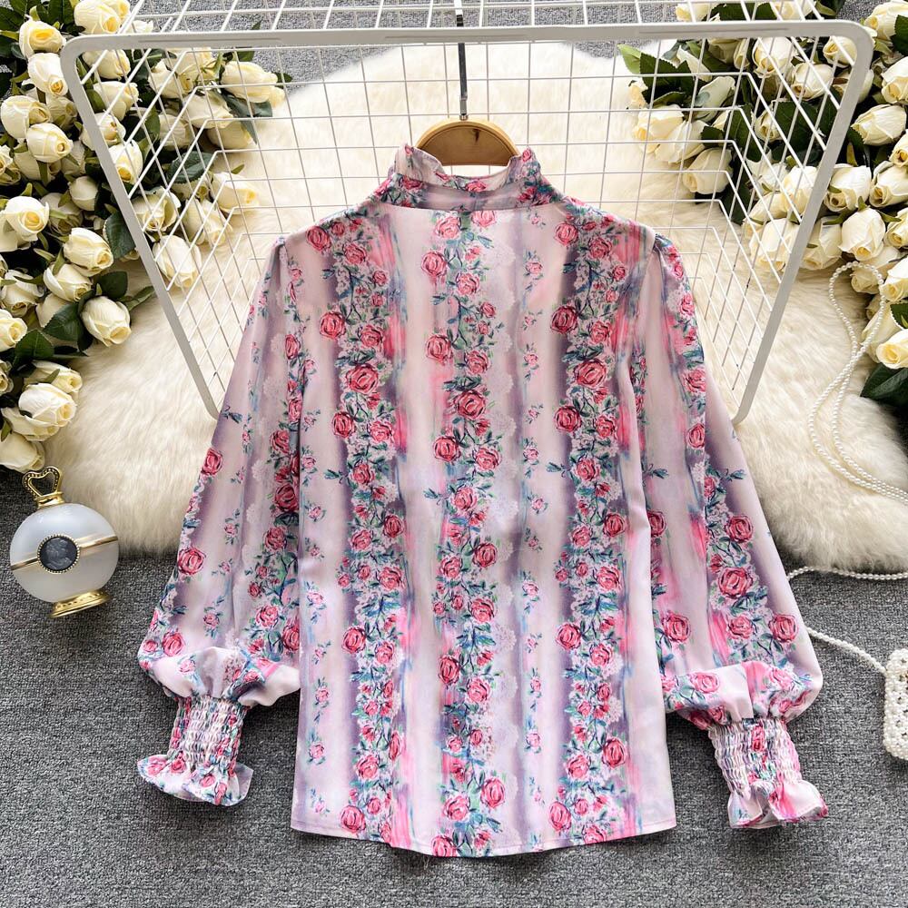 2022年春夏新作パフスリーブ菌エッジカラーシャツトップレディース韓国版洋風シックフローラルシフォンシャツ スプリング 春物 サマー 夏物 花柄 lyxaj7249494115