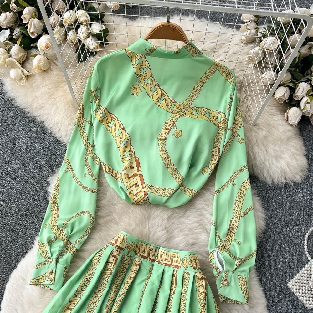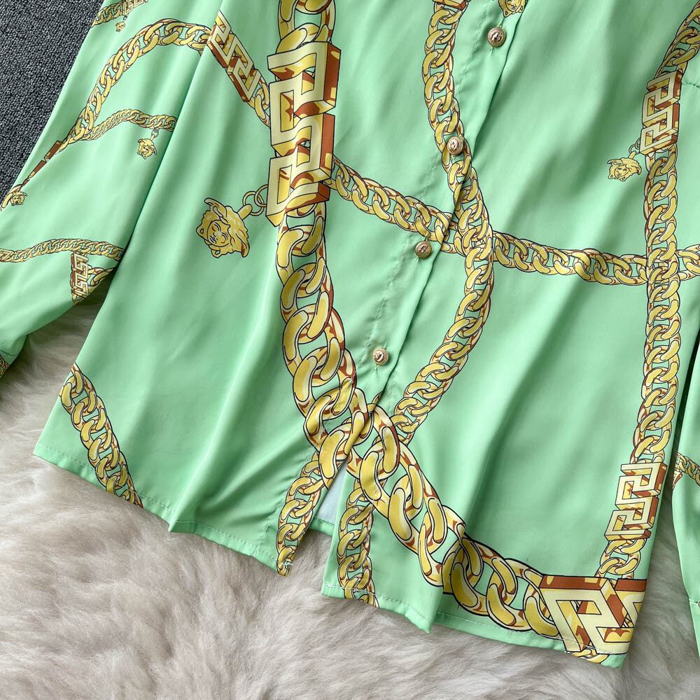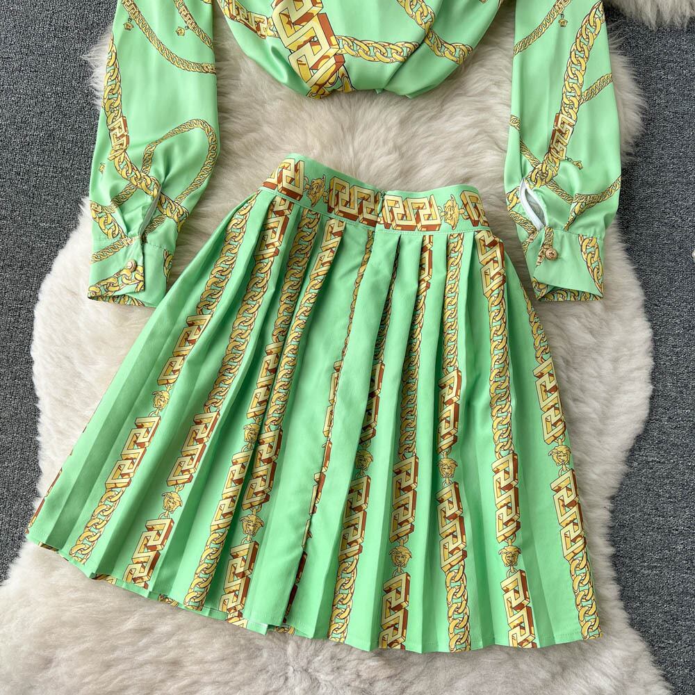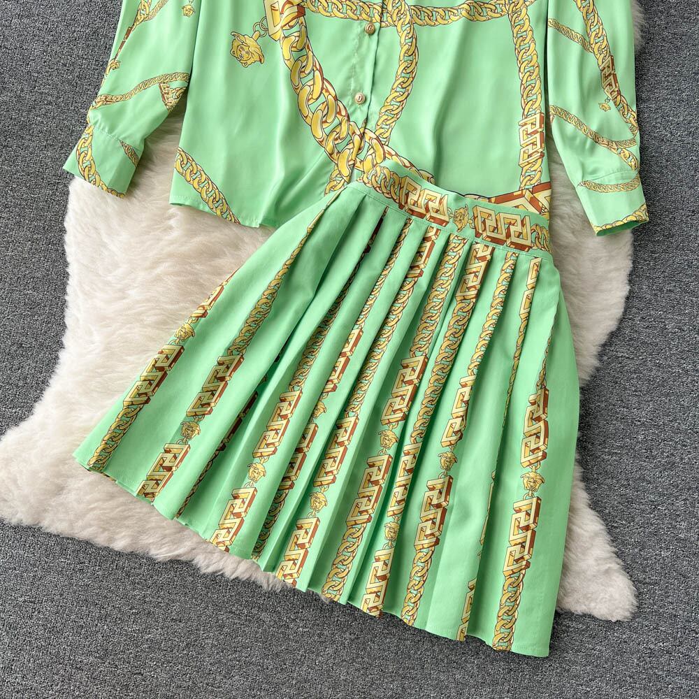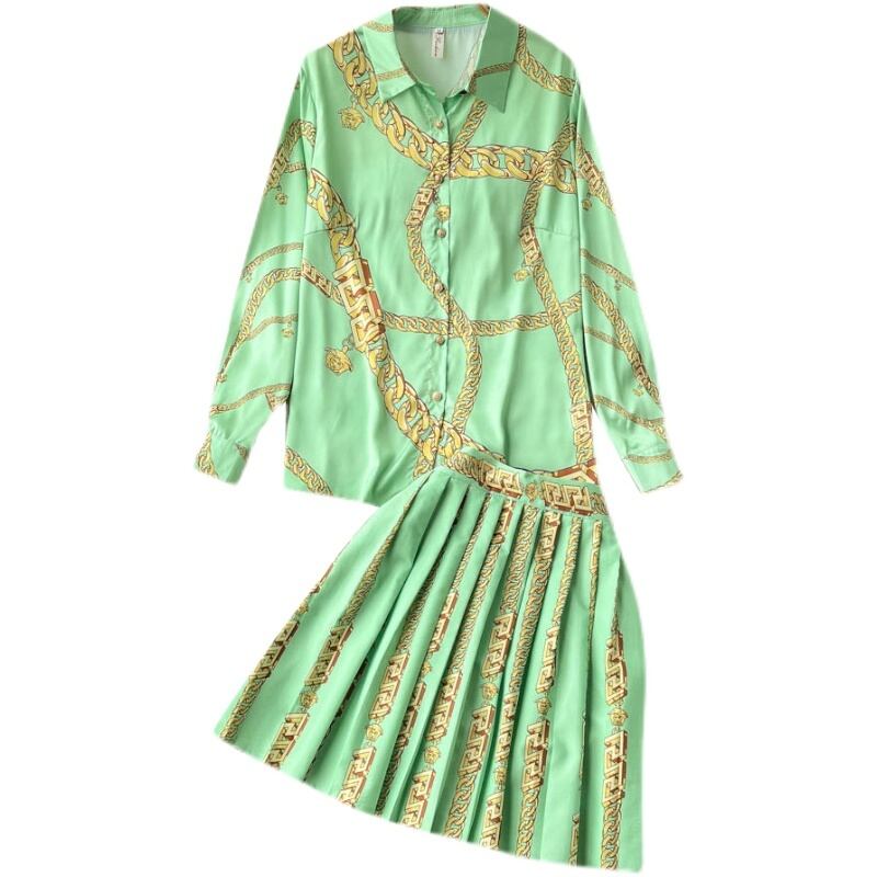 ヨーロッパとアメリカのエレガントな気質印刷ルーズで薄い高品質のシャツ春と秋のハイウエストプリーツスカートツーピースセット ハイウェスト スプリング 春物 オータム 秋物 ヨーロピアン lyxaj24642414766
