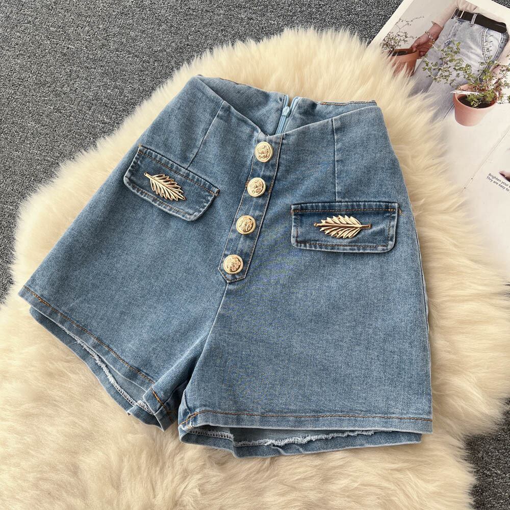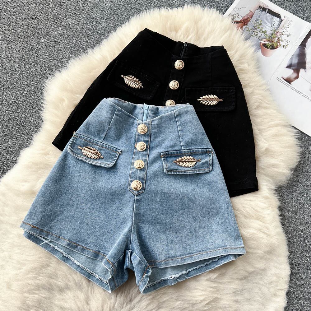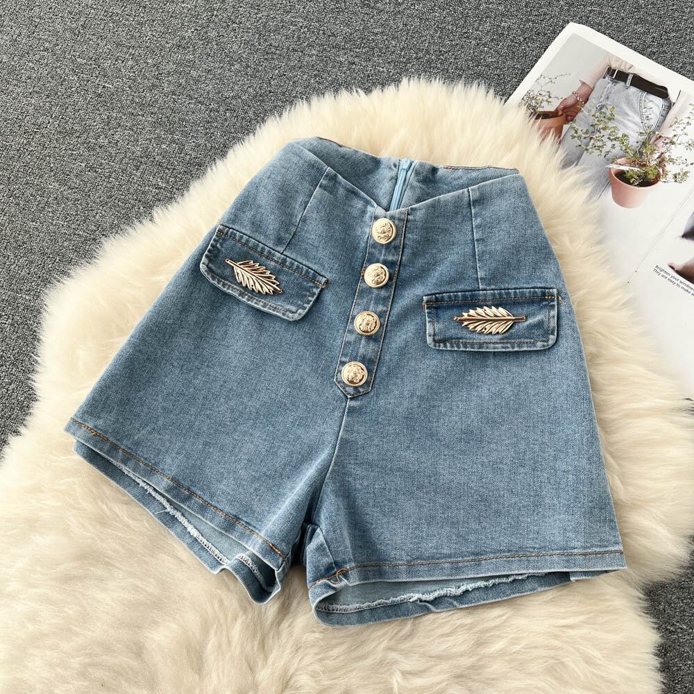 夏の韓国バージョンシックな新しい個性ハイウエストシングルブレストストレッチデニムショーツ女性のスリムスリムワイドレッグホットパンツ サマー 夏物 ブルマー lyxaj42148774964