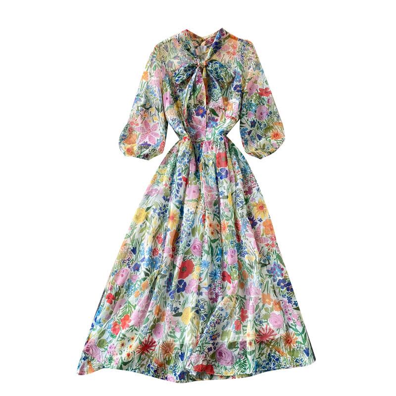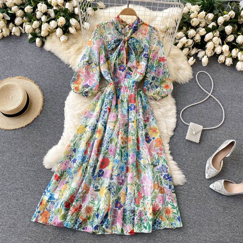 高貴でエレガントな気質の女性の夏の新しい甘い弓の襟スリムなミドル丈シフォンプリントドレス リボン 大人ガーリー スウィート キュート カジュアル サマー 夏物 lyxaj43656497305