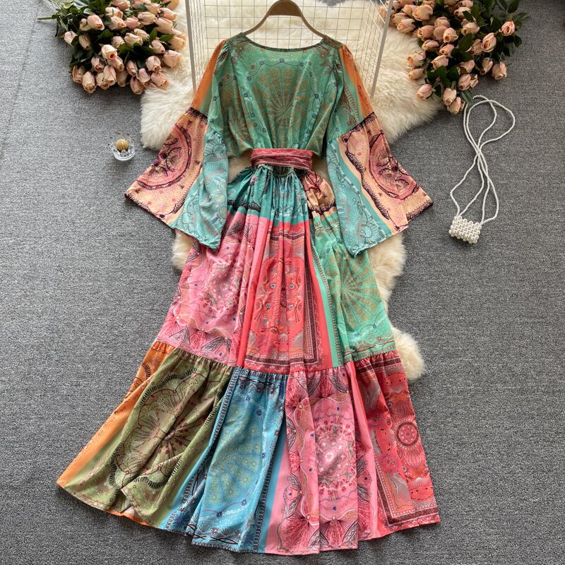 ボヘミアンドレスサマーニューデザインセンスニッチカラーブロックプリントスリムフィットロングレトロホリデースカート 夏物 lyxaj58088872353
