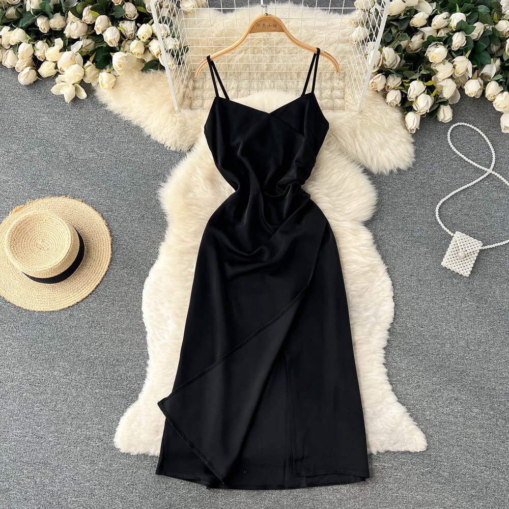 Small slim goddess satin suspender skirt women's pleated waist and thin mid-length irregular slit dress プリーツ スカート サテン スリム lyxaj92144124178