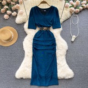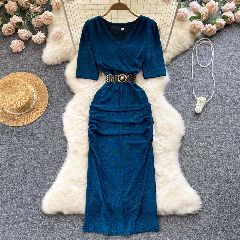 Summer new fashionable temperament celebrity net red V-neck slim slit bag hip dress bright silk waist dress female レッド サマー 夏物 Vネック スリム シルク lyxaj28168124084