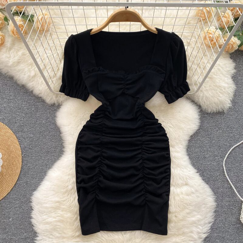 スクエアネックファーストラブドレスレディースサマーニューウエストスリムプリーツスリムスウィート気質フレンチバッグヒップスカート 大人ガーリー キュート カジュアル 夏物 スクウェア lyxaj23298145020