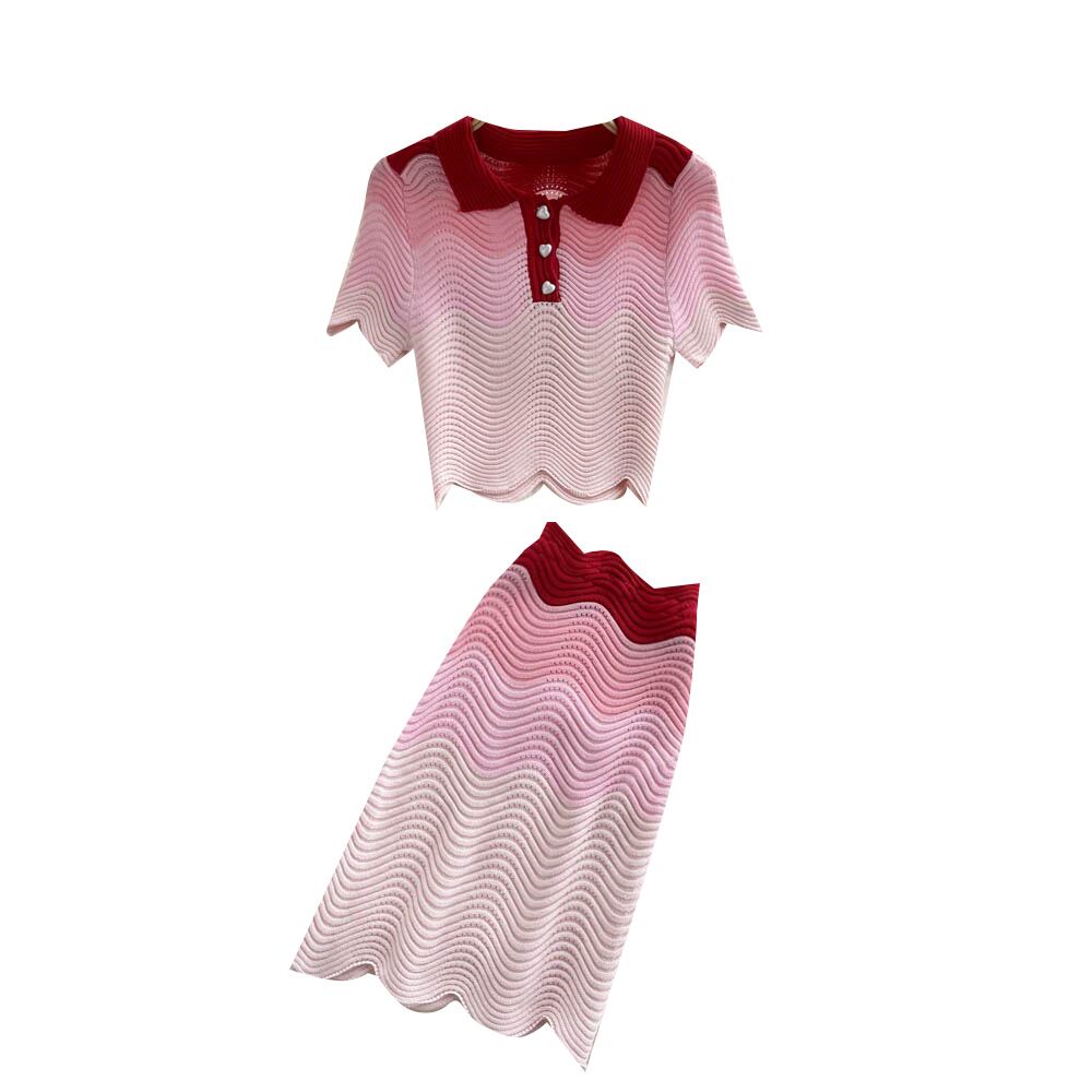 version chic small fresh suit female lapel contrast color wave hem short top skirt knitted two-piece set ショート スカート lyxaj20830799595