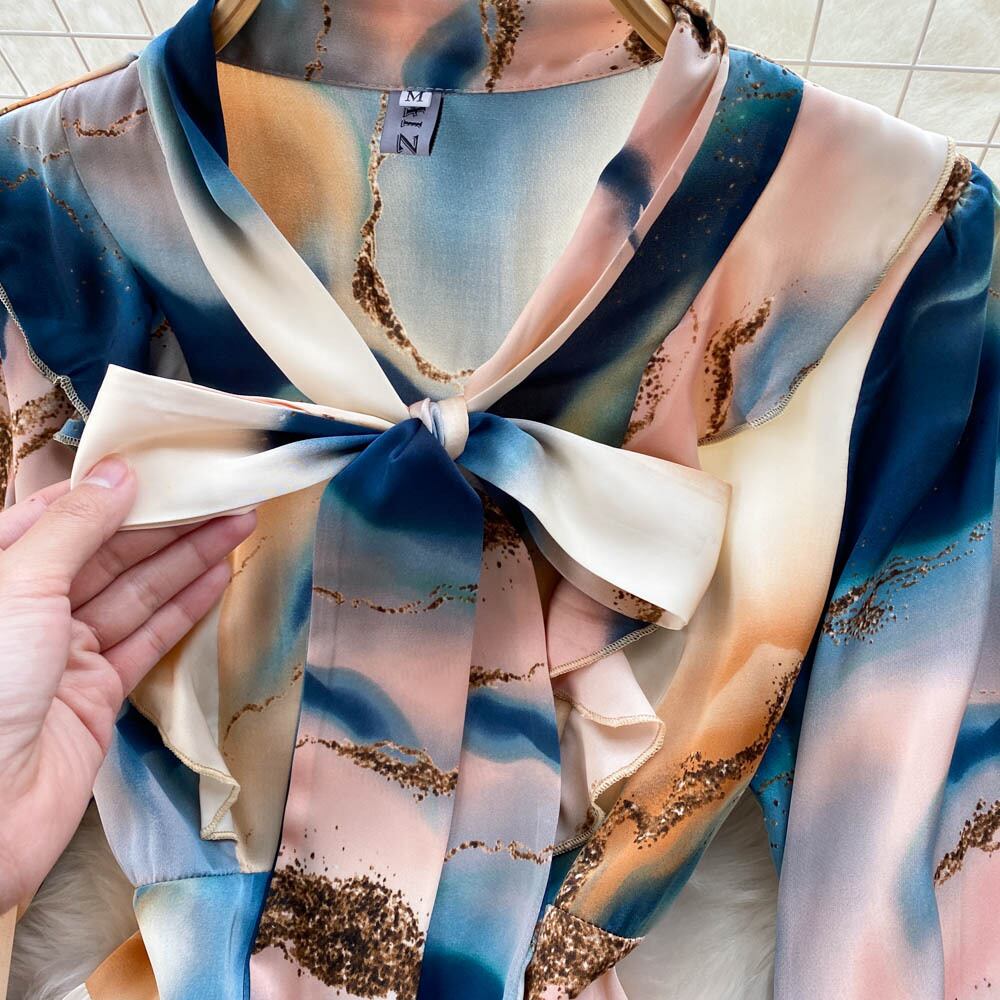春新色長袖ワンピースウエストシーサイドホリデー気質セレブリボンプリントオーバーザニーワンピース ロング スプリング 春物 lyxaj29138421626